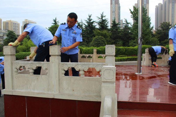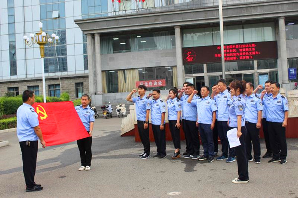 保卫处全体党员同志擦的擦、扫的扫,充分发挥不怕脏、不怕累的精神,把国旗台打扫的焕然一新。随后,同志们高擎右手重温入党誓词,抒发对党的忠诚与强烈的爱国热情。