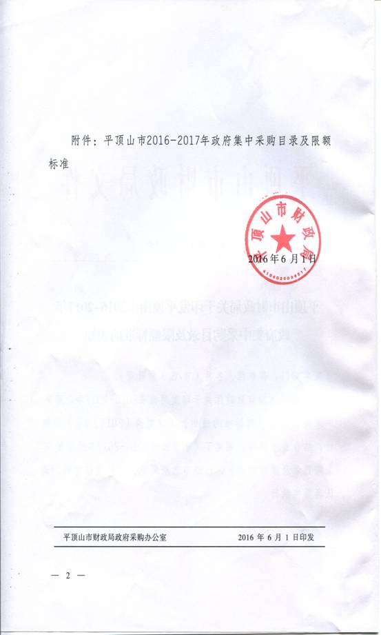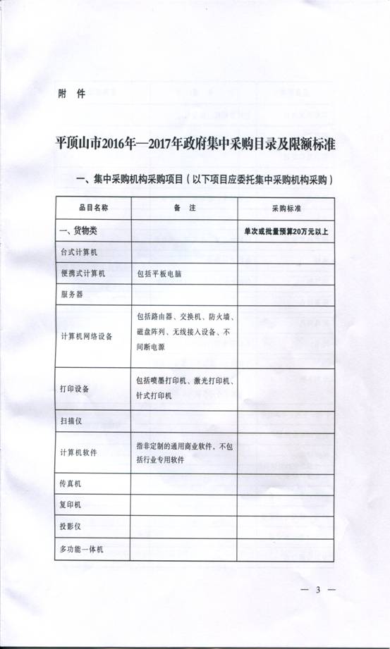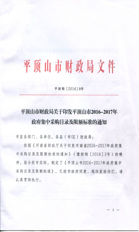 平顶山市财政局关于印发平顶山市2016-2017年政府集中采购目录及限额标准的通知