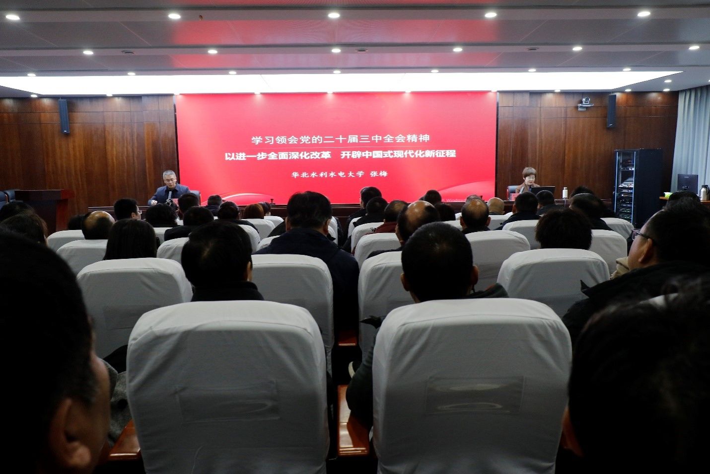 12月25日下午,学习贯彻党的二十届三中全会精神省委教育工委宣讲团成员、华北水利水电大学马克思主义学院院长张梅教授在致知楼第二学术报告厅为我院师生作党的二十届三中全会精神宣讲报告。在平院领导、全体正科级以上干部、师生代表参加报告会。报告会由党委宣传部部长马勇主持。