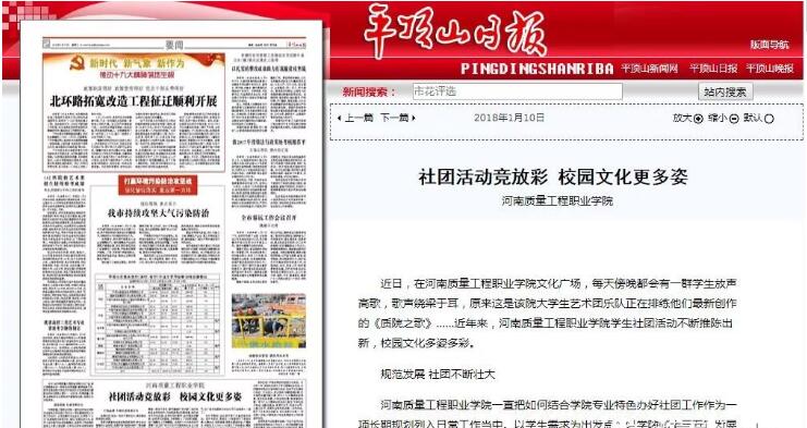 2018年1月10日,《平顶山日报》第A02版刊发文章《香港宝典全年资料库:社团活动竞放彩 校园文化更多姿》对我院学生社团发展进行了报道。