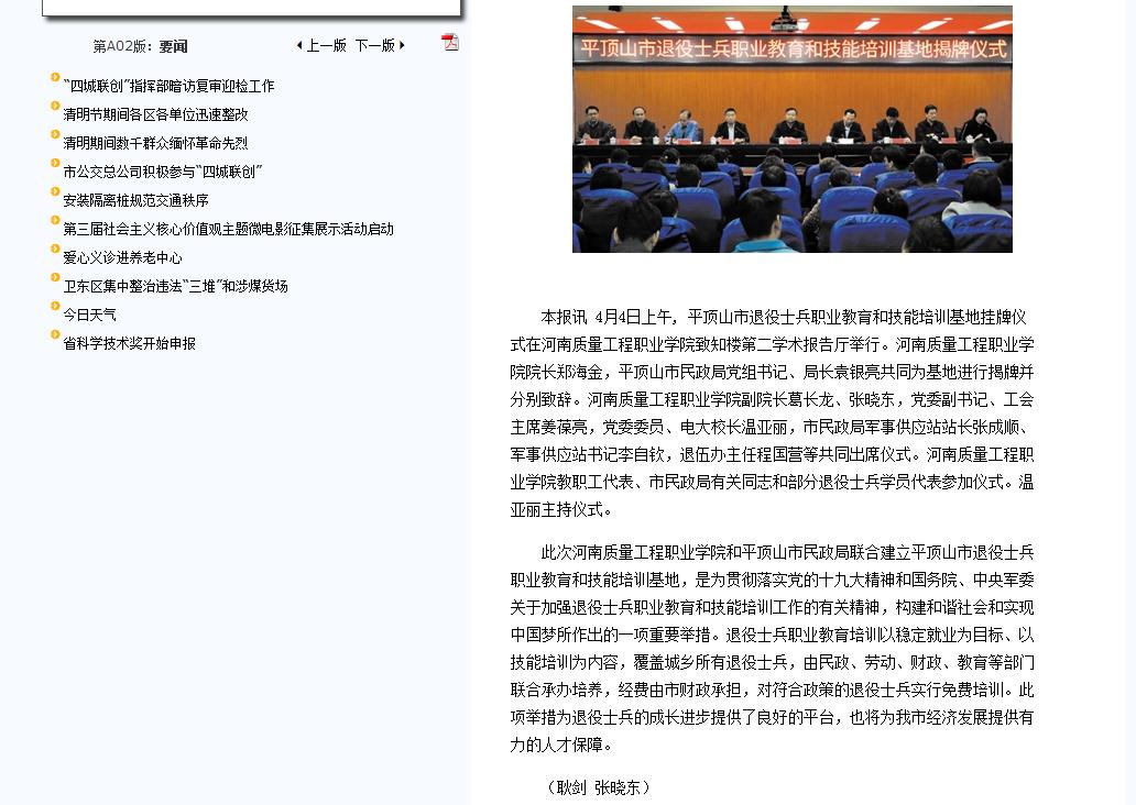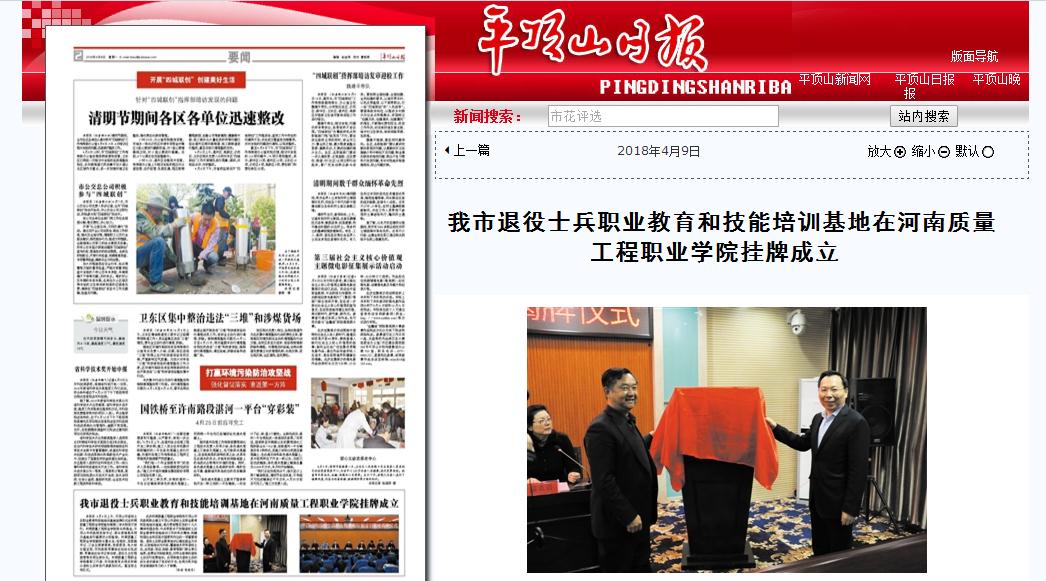 媒体之声|《平顶山日报》:我市退役士兵职业教育和技能培训基地在香港宝典全年资料库挂牌成立