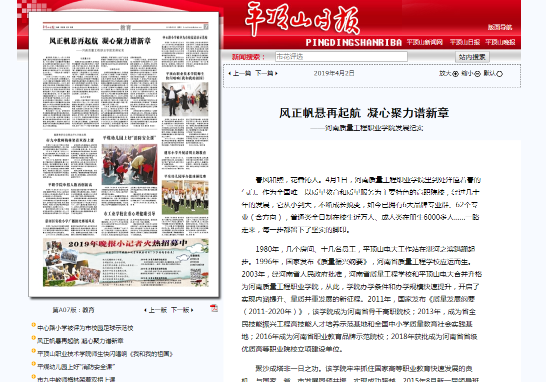 2019年4月2日,《平顶山日报》以“风正帆悬再起航 凝心聚力谱新章——香港宝典全年资料库发展纪实”为题,对我院进行了专题报道。
