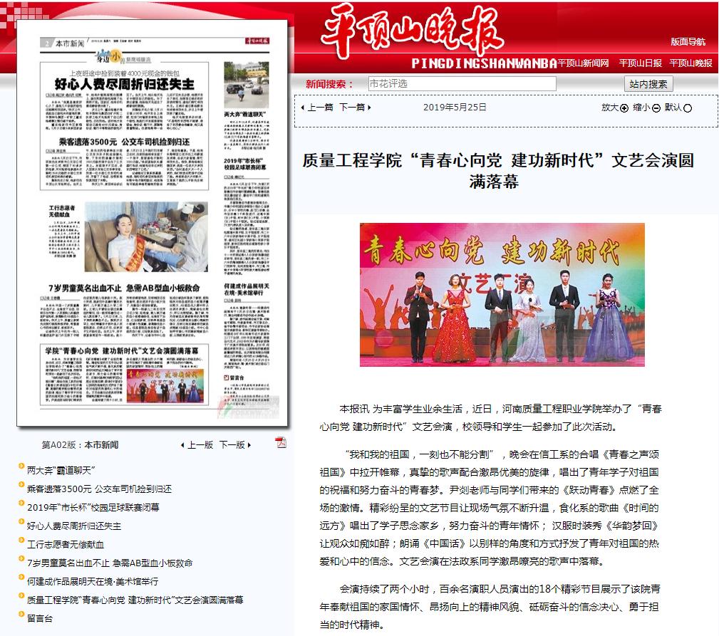 媒体之声|《平顶山晚报》:质量工程学院“青春心向党 建功新时代”文艺会演圆满落幕