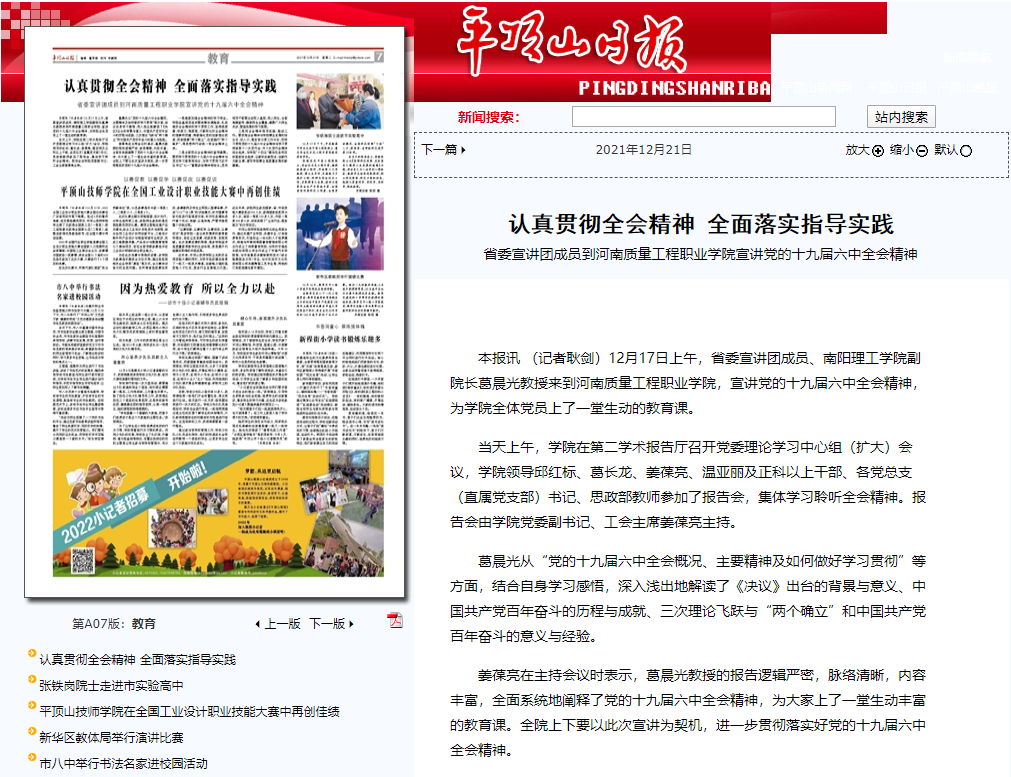 媒体之声 | 《平顶山日报》:认真贯彻全会精神 全面落实指导实践--省委宣讲团成员到香港宝典全年资料库宣讲党的十九届六中全会精神