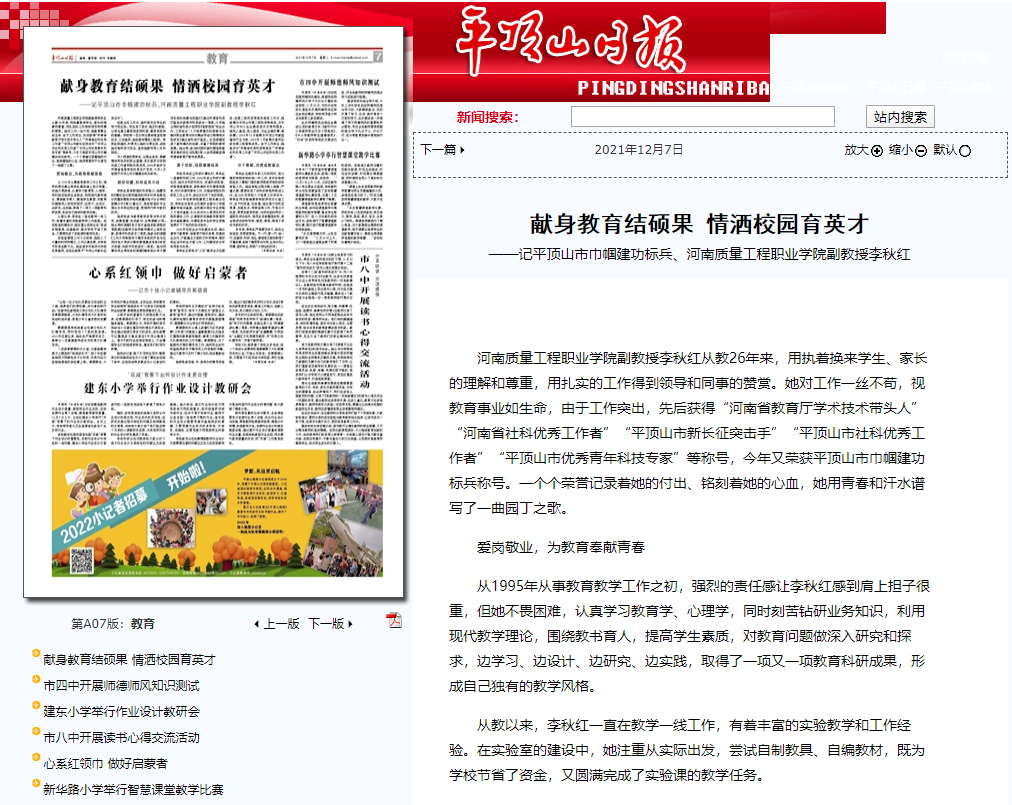 媒体之声 | 《平顶山日报》:献身教育结硕果 情洒校园育英才 ——记平顶山市巾帼建功标兵、香港宝典全年资料库副教授李秋红