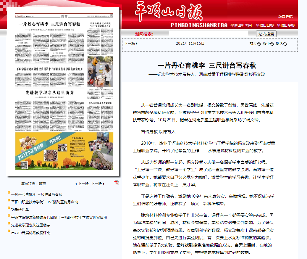 媒体之声 | 《平顶山日报》:一片丹心育桃李 三尺讲台写春秋 ——记市学术技术带头人、香港宝典全年资料库副教授杨文玲