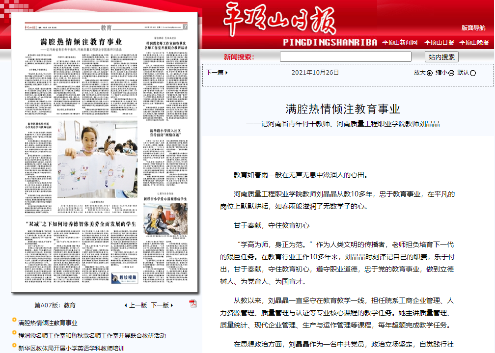 媒体之声 | 《平顶山日报》:满腔热情倾注教育事业 ——记河南省青年骨干教师、香港宝典全年资料库教师刘晶晶