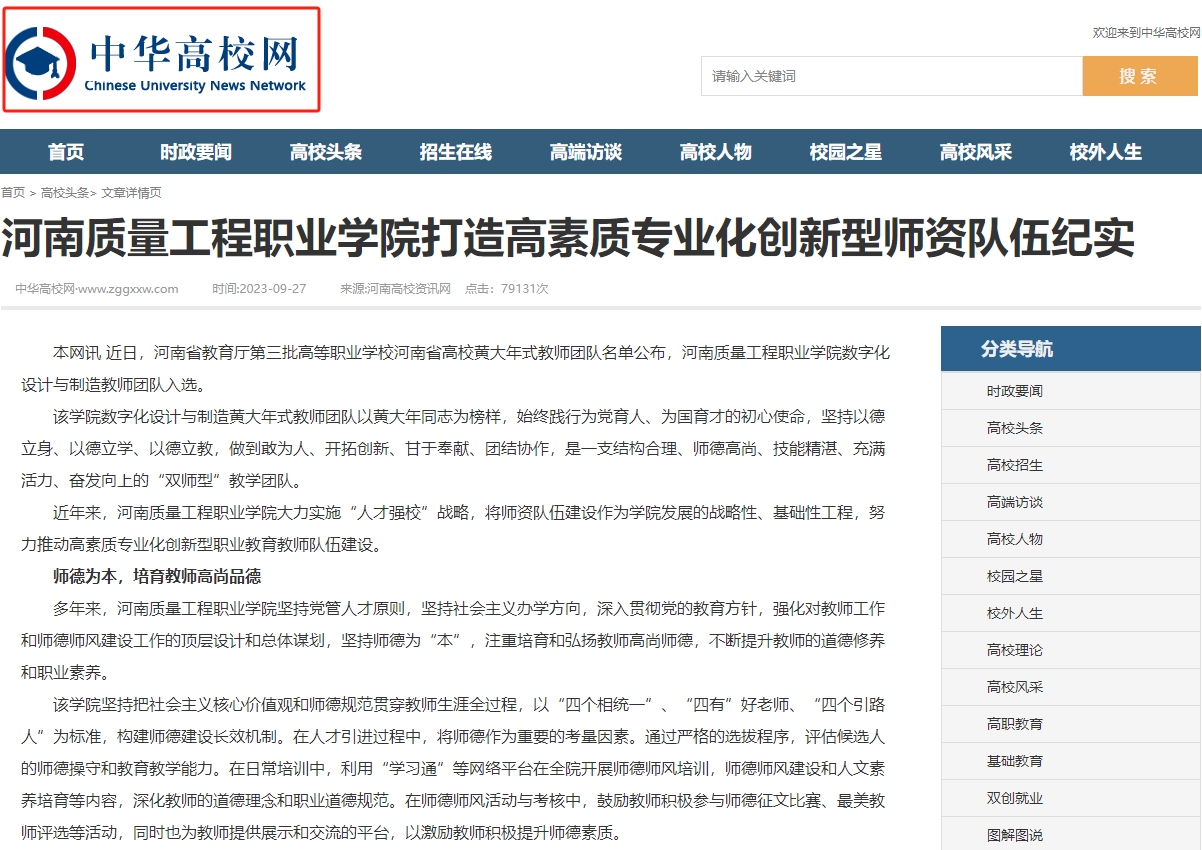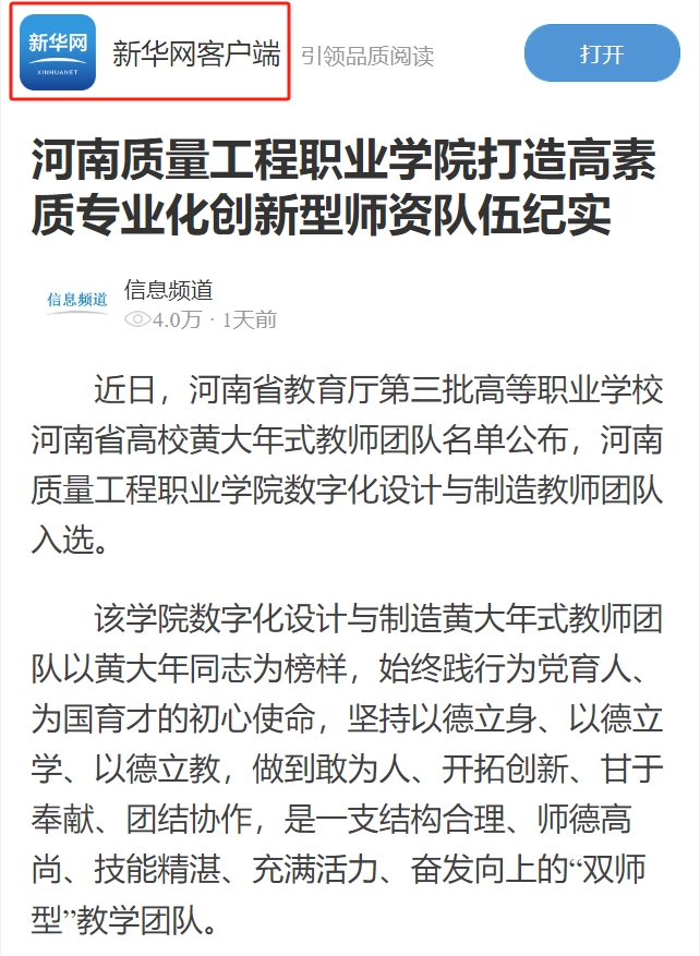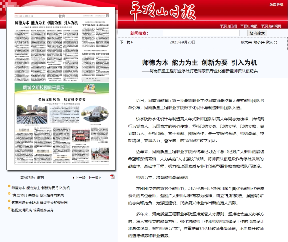 近日,新华网客户端、《平顶山日报》、中华高校网、河南高校资讯网等媒体对我院努力推动高素质专业化创新型职业教育教师队伍建设进行报道。