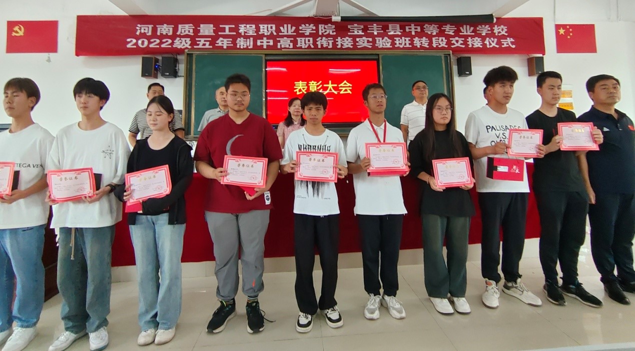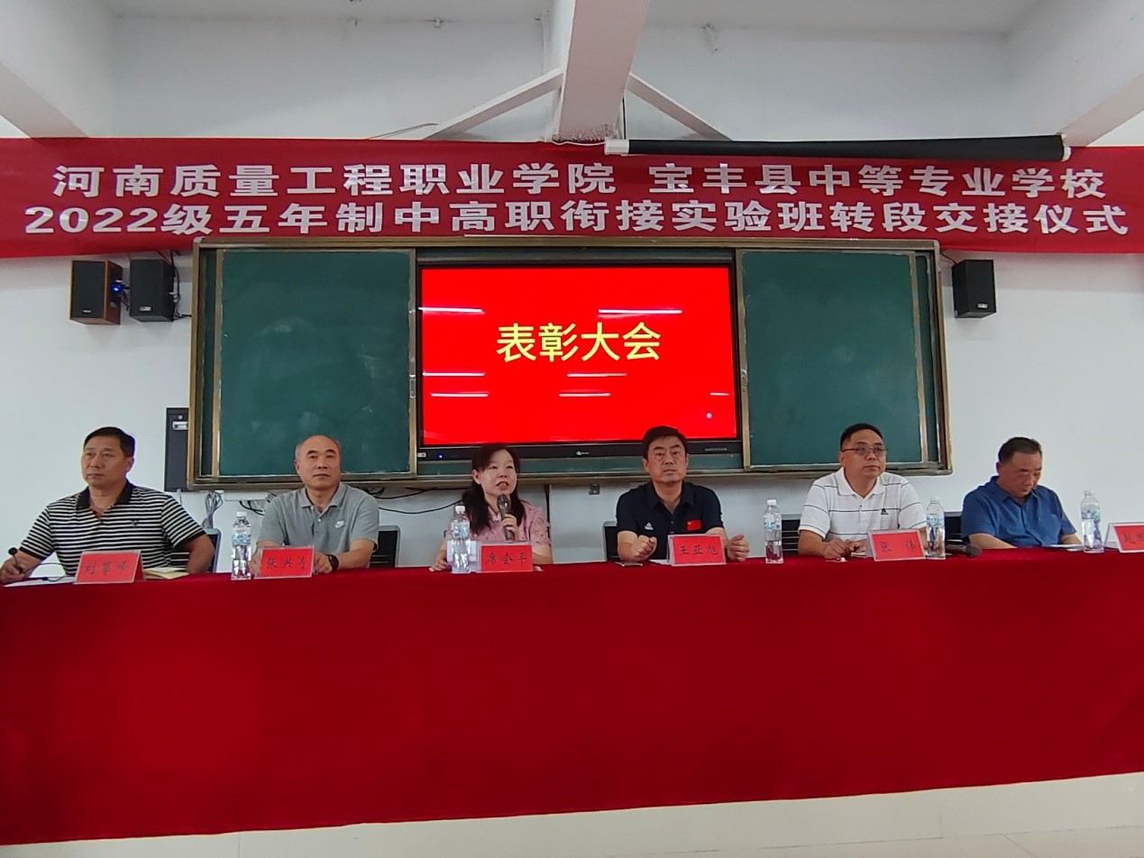 6月7日上午,学院在宝丰县中等专业学校举行2022级五年制中高职衔接实验班(大数据应用技术、药品食品检验)转段交接仪式。学院副院长席会平、宝丰县中等专业学校校长王亚旭出席仪式。仪式由宝丰县中等专业学校副校长刘攀峰主持。