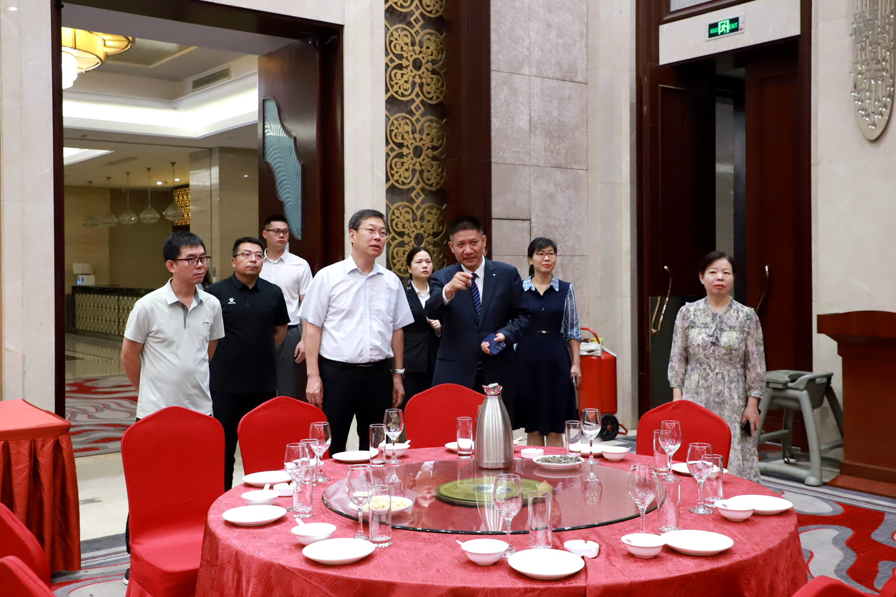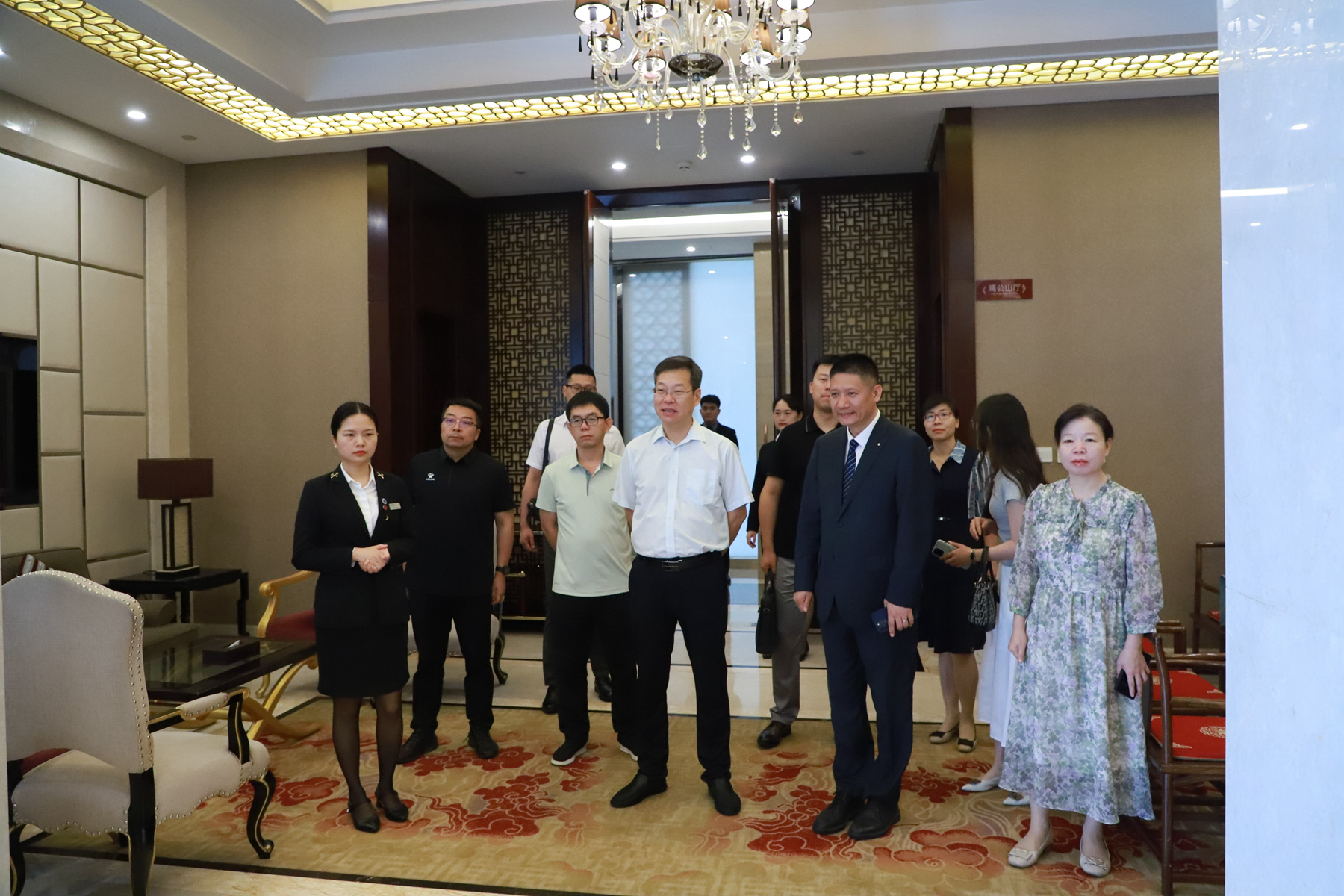 在信阳温德姆酒店,鲁书喜一行在该公司总经理仝晖及其团队的陪同下,深入参观了酒店大厅、会议厅、客房、员工餐厅及宿舍,全面了解酒店企业文化、部门结构、员工及实习生工作和生活环境等。
