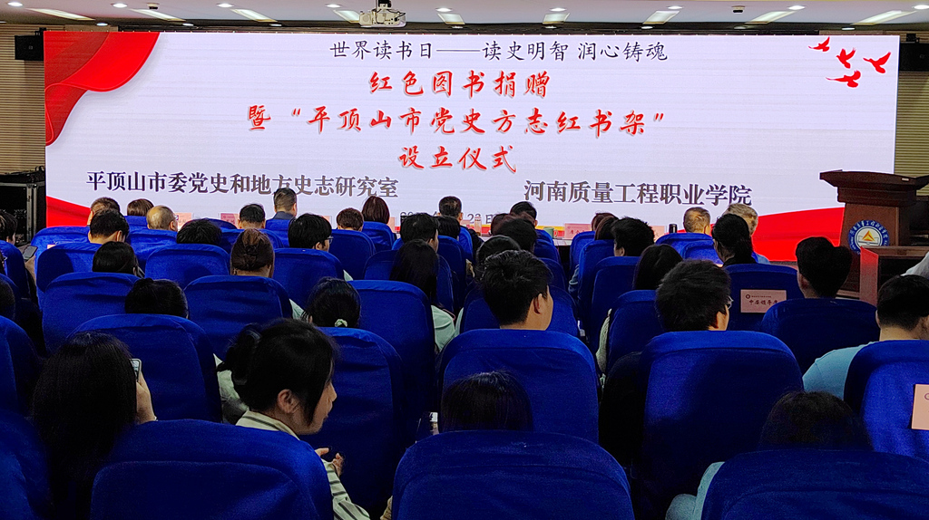 4月23日,在第29个世界读书日到来之际,在第三届全民阅读节活动启动之日,为认真学习贯彻习近平文化思想和关于党史学习教育和地方志工作重要论述精神,扎实推进党史方志“七进”工作,平顶山市委党史和地方史志研究室与我院红色图书捐赠暨“平顶山党史方志红书架”设立仪式在我院致知楼第二学术报告厅举行。平顶山市委党史和地方史志研究室主任苏红英,学院领导邱红标、姜葆亮、席会平、张留成出席活动。