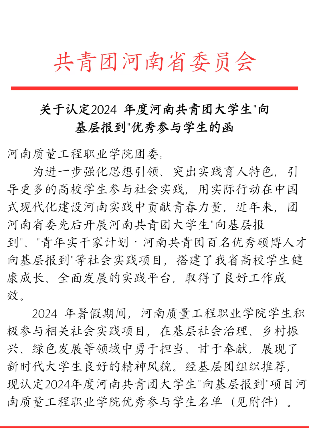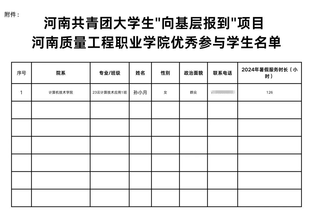 近日,共青团河南省委员会印发《关于认定2024年度河南共青团大学生“向基层报到”优秀参与学生的函》,我校计算机技术学院孙小月同学被共青团河南省委认定为2024年度河南共青团大学生“向基层报到”项目优秀参与学生。