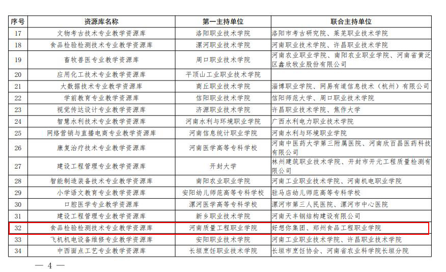 近日河南省教育厅公示了2023年河南省职业教育专业教学资源库立项建设名单。我院作为第一主持单位主持的食品检验检测技术专业教学资源库成功入选建设项目立项公示名单。具体名单如下: