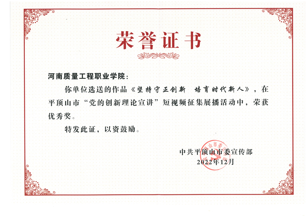 近日,由平顶山市委宣传部获悉,我院选送的《坚持守正创新 培育时代新人》在全市“党的创新理论宣讲”短视频征集展播活动中荣获优秀奖。
