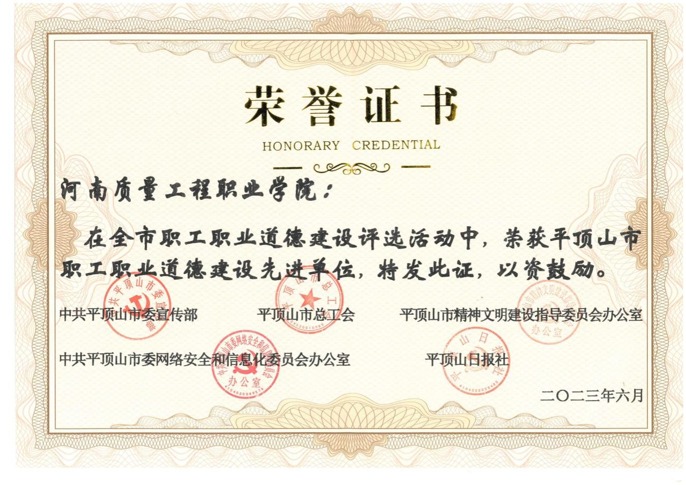 日前,我院在“平顶山市职工职业道德建设评选表彰”活动中,被评为平顶山市职工职业道德建设先进单位。