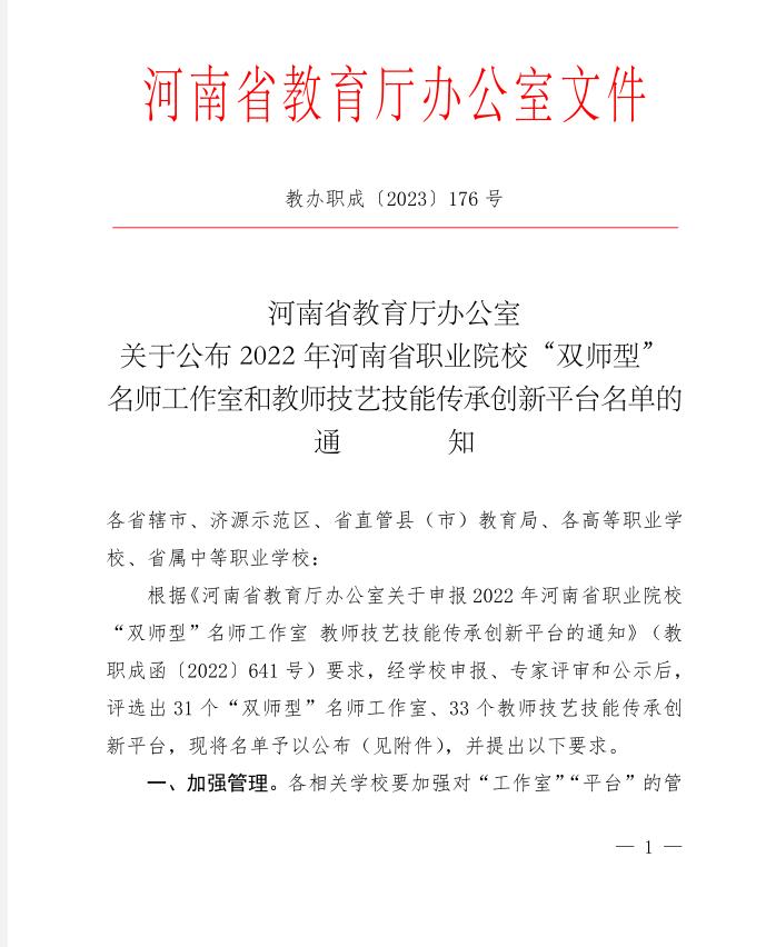 近日,河南省教育厅发布了《关于公布2022年河南省职业院校“双师型”名师工作室和教师技艺技能传承创新平台名单的通知》(教办职成〔2023〕176号),我院教师席会平主持的食品检验检测技术专业“双师型”名师工作室获批立项。