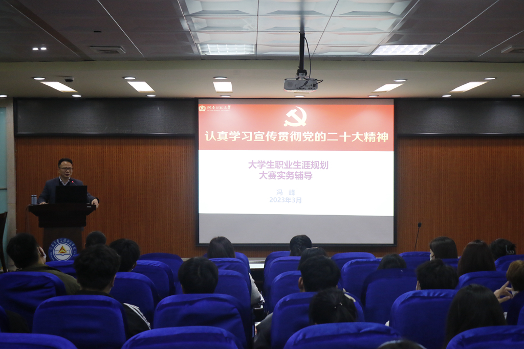 此次讲座学院特邀请河南师范大学冯峰教授来我院作大学生职业生涯规划大赛实务辅导专题讲座。冯教授是全国高校就业创业指导教师培训特聘专家,职业生涯规划师,连续从事就业创业指导服务26年。讲座从大赛举办概述、大赛基本内容和大赛参赛技巧三个维度展开。首先,冯教授介绍了近十几年来职业生涯规划国赛和省赛的概况,特别指出职业目标有特色,融合小我与大我的统一的学生更适合参赛。其次,冯教授详细解读了大学生职业规划的组织、内容、流程、大赛系列活动和有关要求。他紧扣我省职业生涯规划大赛相关文件,对参赛作品的内容和评分要求做了生动的讲解,重点突出,通俗易懂。最后,冯教授重点分享了参赛选手做好生涯规划的方法和技巧,为我院同学们在职业生涯规划大赛中取得好成绩提供了正确指导。无论是规划书的撰写,还是上台展示环节,冯教授都是条分缕析,结合往年比赛案例,具体生动,受益匪浅。
