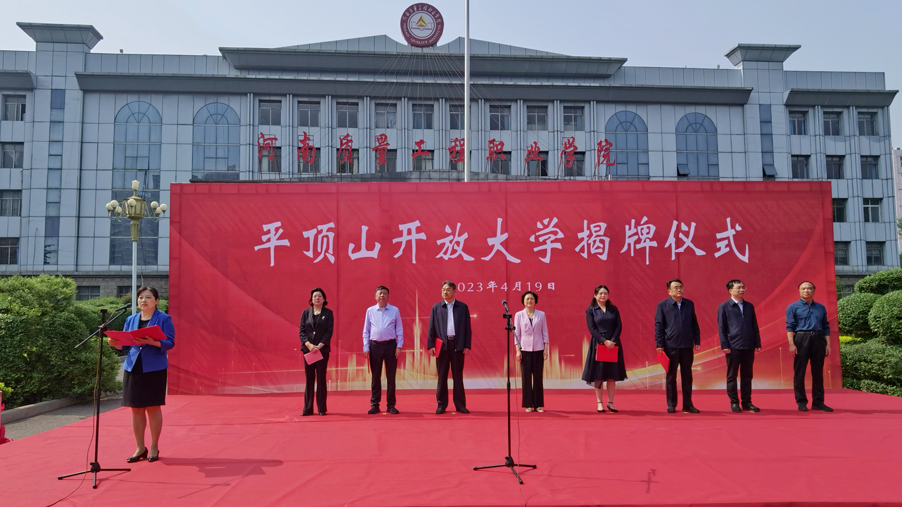河南开放大学党委书记赵继红,党委委员、副校长张树军,平顶山市人民政府副市长史晓天,我院党委书记邱红标、院长李志萍,林州建筑职业技术学院党委书记温亚丽,平顶山市人民政府副秘书长、办公室主任张昌升,市教育体育局党组书记、局长孙洪涛,我院副院长葛长龙等出席仪式。平顶山开放大学汝州、舞钢、鲁山、宝丰、叶县、郏县6个县级分校的负责人,我院相关单位、部门负责人及教职工代表参加仪式。仪式由李志萍主持。