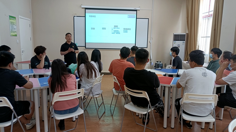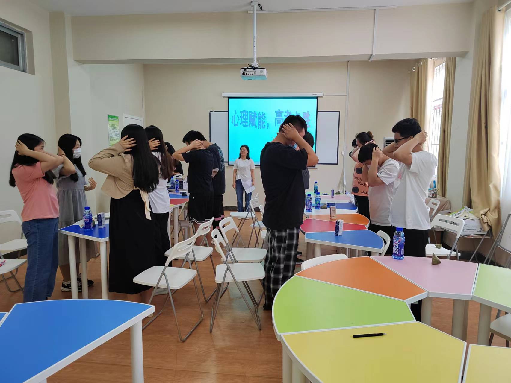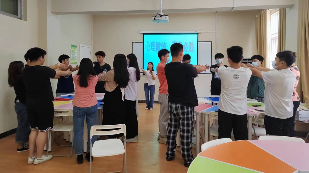 团体辅导分为两个部分。首先,由中心的王光武老师开展了《释放压力,赋能前行》的考前小讲座。针对考前压力大、学不进去,考场焦虑紧张、大脑一片空白,考后志愿填报等相关问题,为考生们提供简单实用的小妙招,帮助考生考前高效备考,考场正常发挥,考后合理规划。随后,郝梅老师带领大家举行了几个减压心理游戏。通过《举臂三分钟》,让大家体会在痛苦时,通过群体间的相互体察和交流,能有效降低痛苦感,从容学习。通过《先下手为强》《滚蛋吧,鸭梨君!》等小游戏,同学们在欢声笑语中,尽量释放压力,甩掉烦躁、不安等不良情绪,重拾自身力量,保持最佳状态,以更加积极、乐观、放松、自信的精神状态迎接高考。