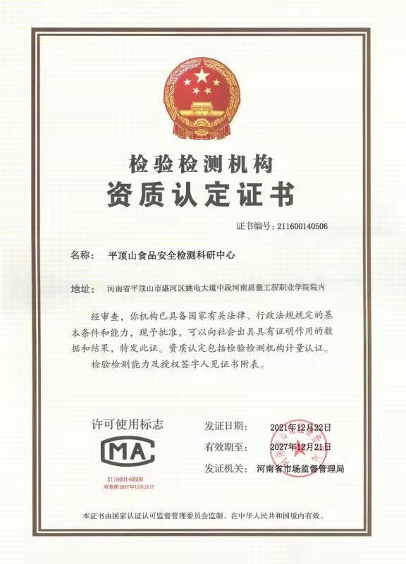 近日,经河南省市场监督管理局批准,授予我院食检中心“CMA资质认定证书”。