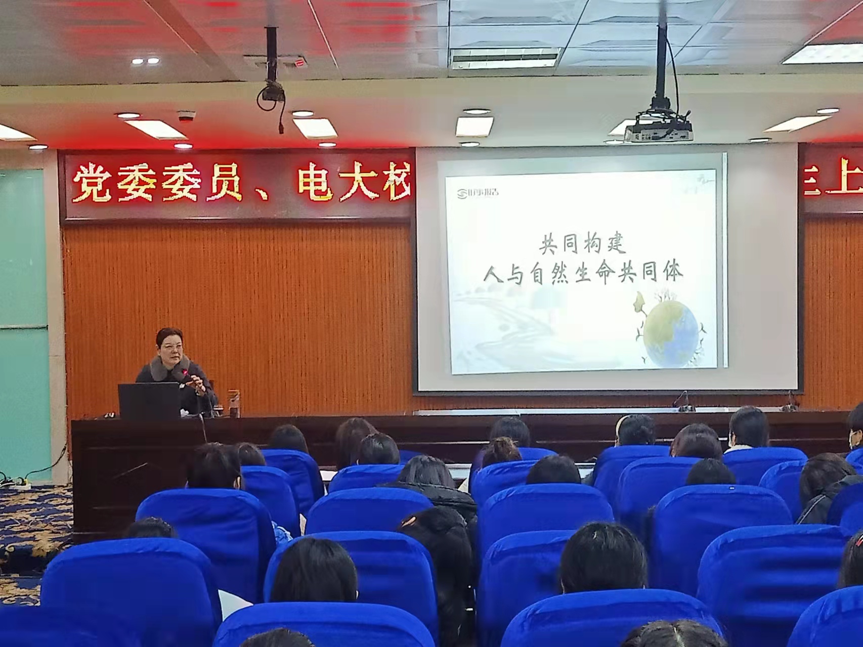 12月10日下午,学院党委委员、电大校长温亚丽教授在第二学术报告厅为人文艺术学院21教育管理7、8班,21营养健康管理三个班的学生上了一堂题为《共同构建人与自然生命共同体》的形势与政策课。
