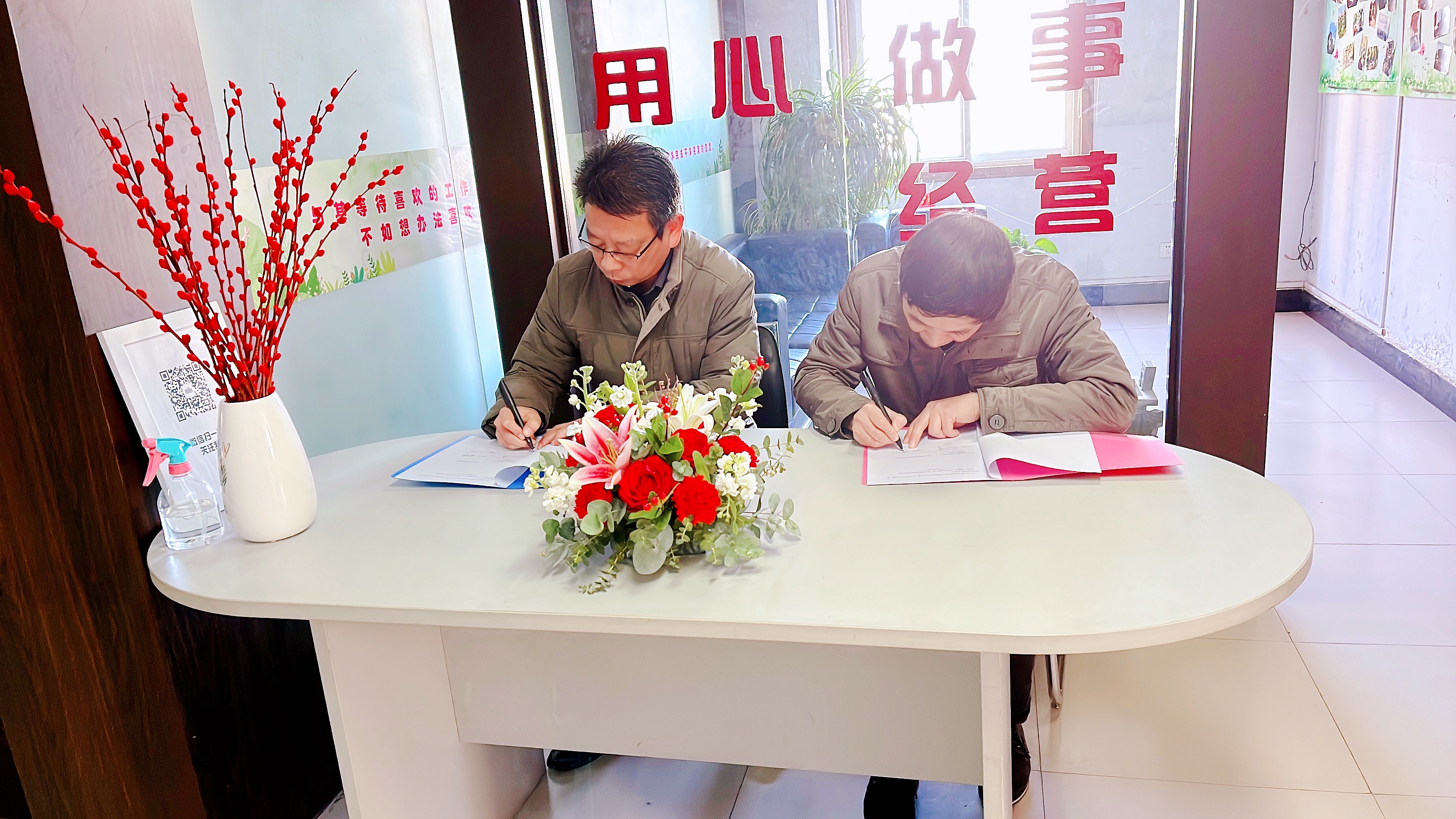 王桔洲、郭万魁分别代表学院和企业签署了《校企合作实习就业基地协议书》