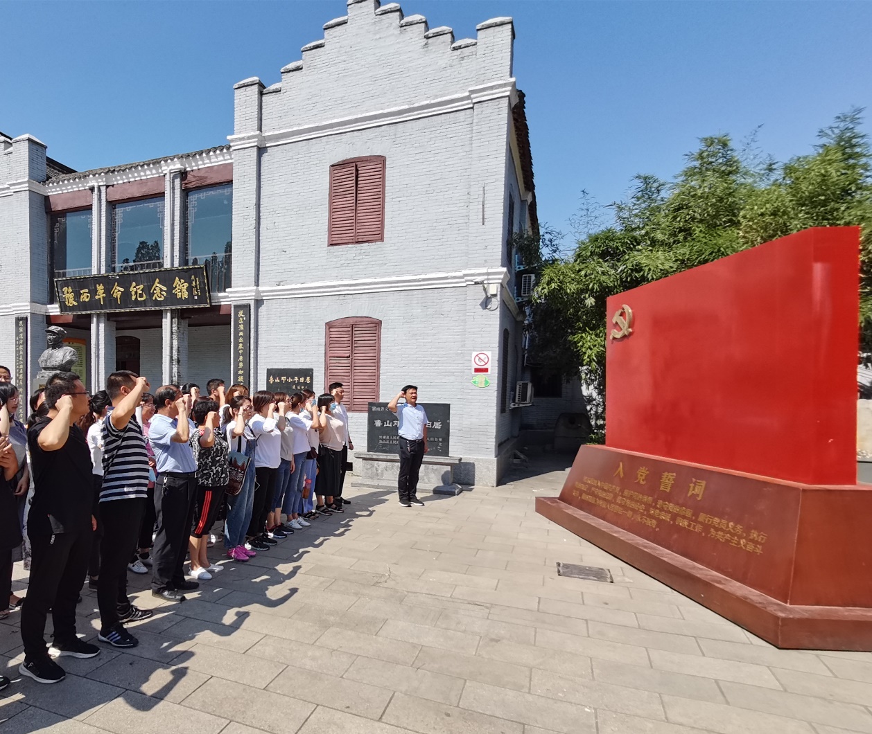 6月22日,经济与管理学院党总支全体党员赴鲁山豫西革命纪念馆开展红色教育。在纪念馆广场鲜红的党旗下,由党总支书记李冰领誓,党员教师们重温了入党誓词,表达了对革命先烈的崇高敬意,展现了坚守初心的坚定信念。