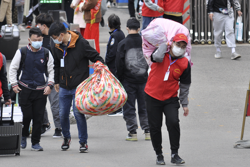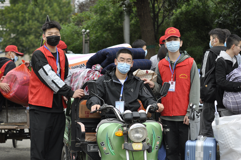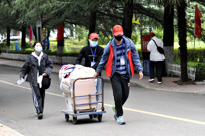 由于新生家长不陪同进校,学院安排志愿者引导新生进行报到,志愿者团队帮助新生搬运行李、指引路径、维持秩序、解惑答疑,从校外车站到校门口到报到场地再到宿舍区,校园里到处都活跃着志愿者热情服务的身影,成为了迎新当天一道靓丽的风景线。
