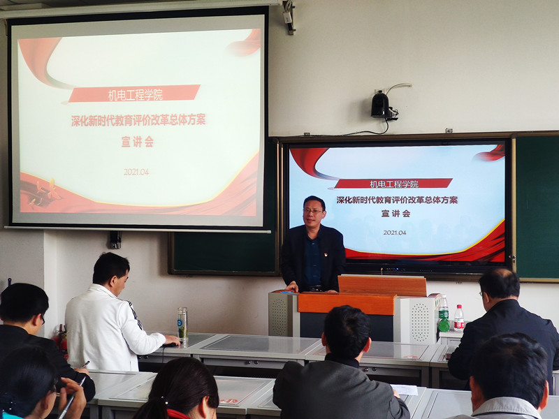 4月28日下午,机电工程学院在食检大楼二楼智慧教室召开全体教师大会,集中学习《深化新时代教育评价改革总体方案》。