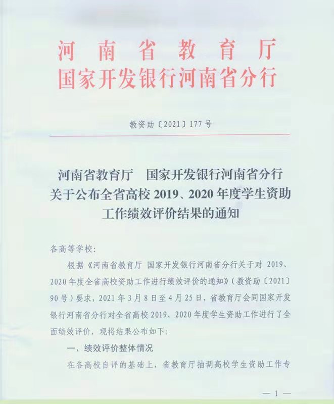 5月24日,河南省教育厅公布了2019、2020年度学生资助工作绩效考评结果(教资助〔2021〕177号),我院学生资助工作绩效考核获评“良好”等次,在全省151所高校中综合排名38。