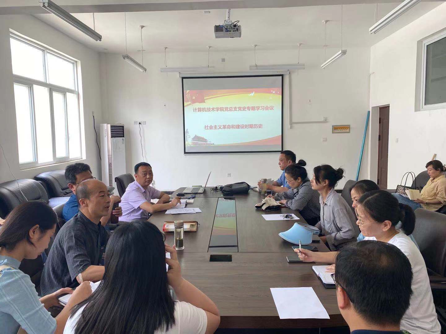 5月19日上午,计算机技术学院党总支召开全体党员学习会议,专题学习社会主义革命和建设时期党的历史。会议领学了习近平《论中国共产党历史》中《在纪念中国人民志愿军抗美援朝出国作战七十周年大会的讲话》,要求大家认真研读《中国共产党简史》和《毛泽东邓小平江泽民胡锦涛关于中国共产党历史论述摘编》中的相关篇章。党总支中心组成员围绕学习社会主义革命和建设时期历史的感悟体会,结合工作实际作了交流发言。