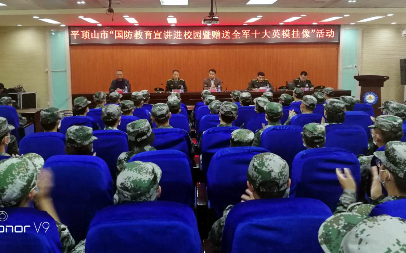 10月20日上午,平顶山市“国防教育宣讲进校园暨赠送全军十大英模挂像”活动在我院致知楼4201学术报告厅举行,平顶山军分区政治工作处主任王万里、学院党委副书记姜葆亮出席活动,学院武装部相关人员、学生代表110余人参加活动。活动由湛河区武装部政委王中生主持。