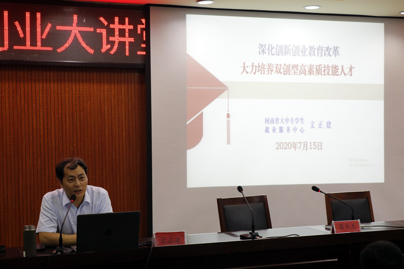 文正建作了题为《深化创新创业教育改革,大力培养双创型高素质技能人才》的专题报告。他首先介绍了“互联网+”创新创业大赛的发展历程,然后从当今时代大势,增强双创责任感;把握国家教育方针,明确高校新使命;理清四大重点问题,形成双创凝聚力;借鉴高校成熟经验,协同育人谱新篇等四个方面,对创新创业形势及双创政策进行了详细的解读。