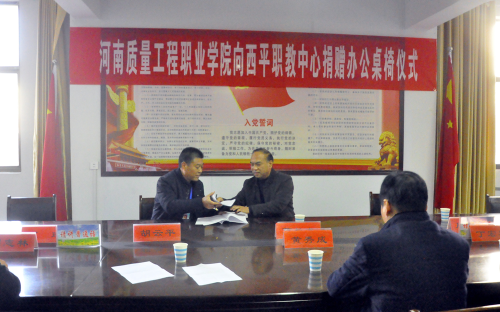 12月9日上午,副院长葛长龙赴驻马店西平职教中心开展招生交流,代表学院捐赠了一批价值近4万元的办公桌椅。招生办主任贾琦等有关人员参加交流活动。西平县教育局副局长黄秀成、西平职教中心全体领导班子及部分教师代表参加了捐赠仪式。