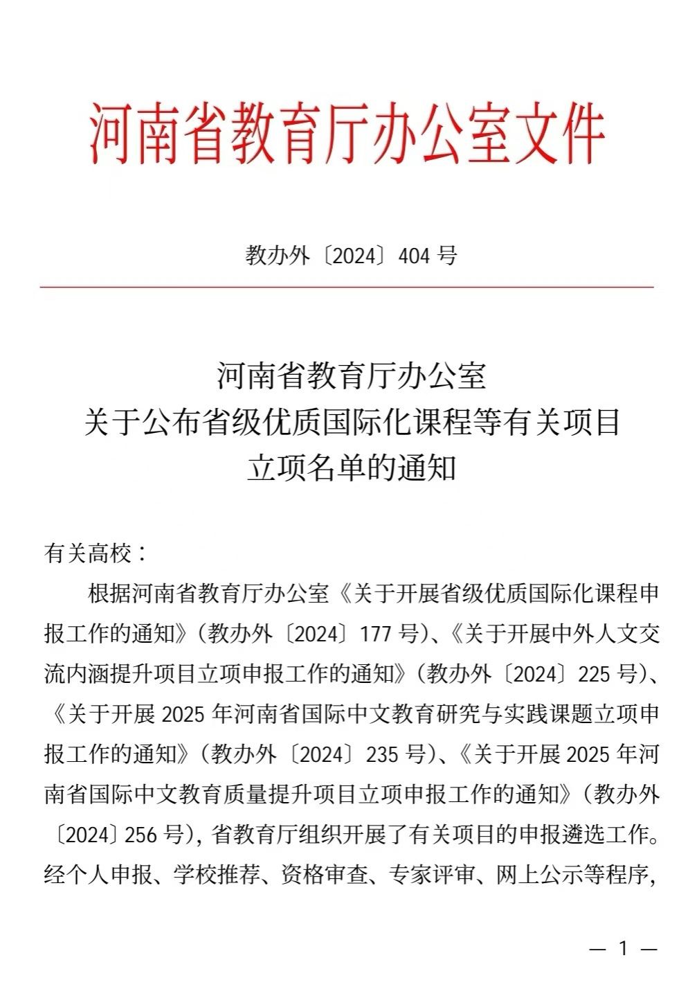 近日,河南省教育厅公示了《省级优质国际化课程等有关项目立项名单的通知》(教办外〔2024〕404号),我院参与申报的1个项目获批立项。此次立项,促进了学院教师国际化教学能力的提升,拓宽了国际化视野,也为国际化人才培养提供了有力的保障。