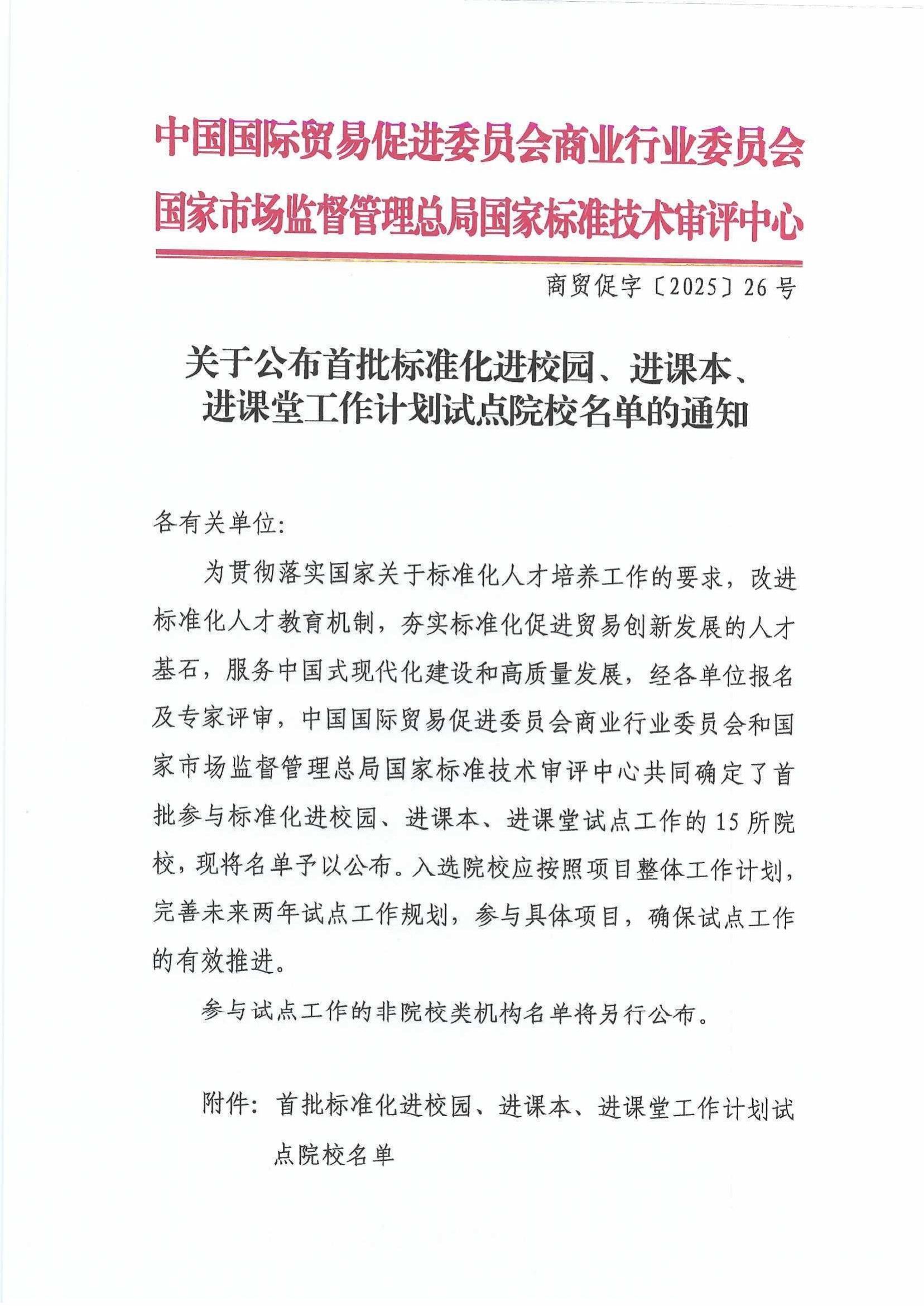近日,我院被确定为“标准化进校园、进课本、进课堂”工作计划首批15所试点院校之一。此次活动由中国国际贸易促进委员会商业行业委员会和国家市场监督管理总局国家标准技术审评中心联合开展,旨在面向职业院校和普通高等院校着力厚植标准化土壤,夯实标准化促进贸易创新发展的人才基石。