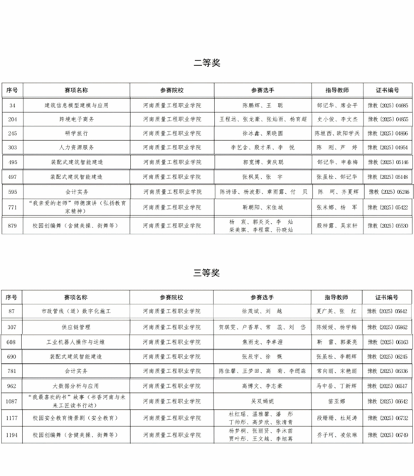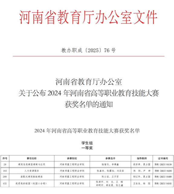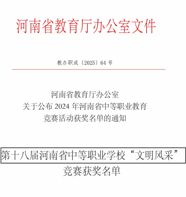 近日,河南省教育厅下发了《关于公布 2024 年河南省高等职业教育技能大赛获奖名单的通知》(教办职成〔2025〕76 号)、《关于公布2024年河南省中等职业教育竞赛活动获奖名单的通知》(教办职成〔2025〕64号)文件,我院喜获河南省高等职业教育技能大赛一等奖4项、二等奖9项、三等奖9项,河南省中等职业教育竞赛二等奖1项、三等奖4项。