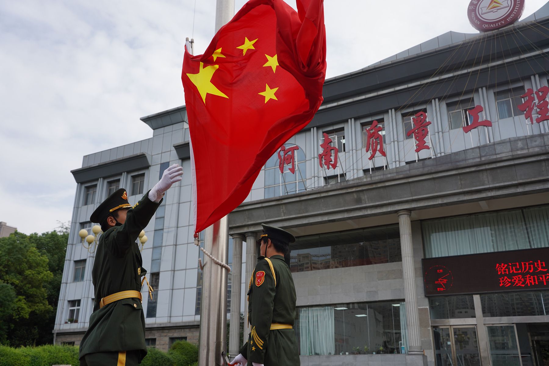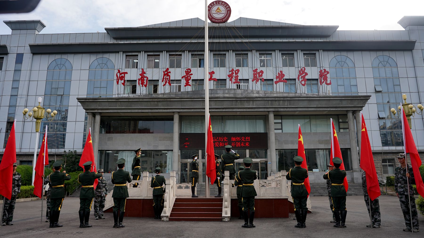 仪式开始,国旗护卫队军容严整,迈着铿锵步伐护卫国旗入场。伴随激昂国歌,五星红旗冉冉升起,全体师生庄严肃立、敬礼致敬,嘹亮国歌传递对祖国的赤诚热爱。