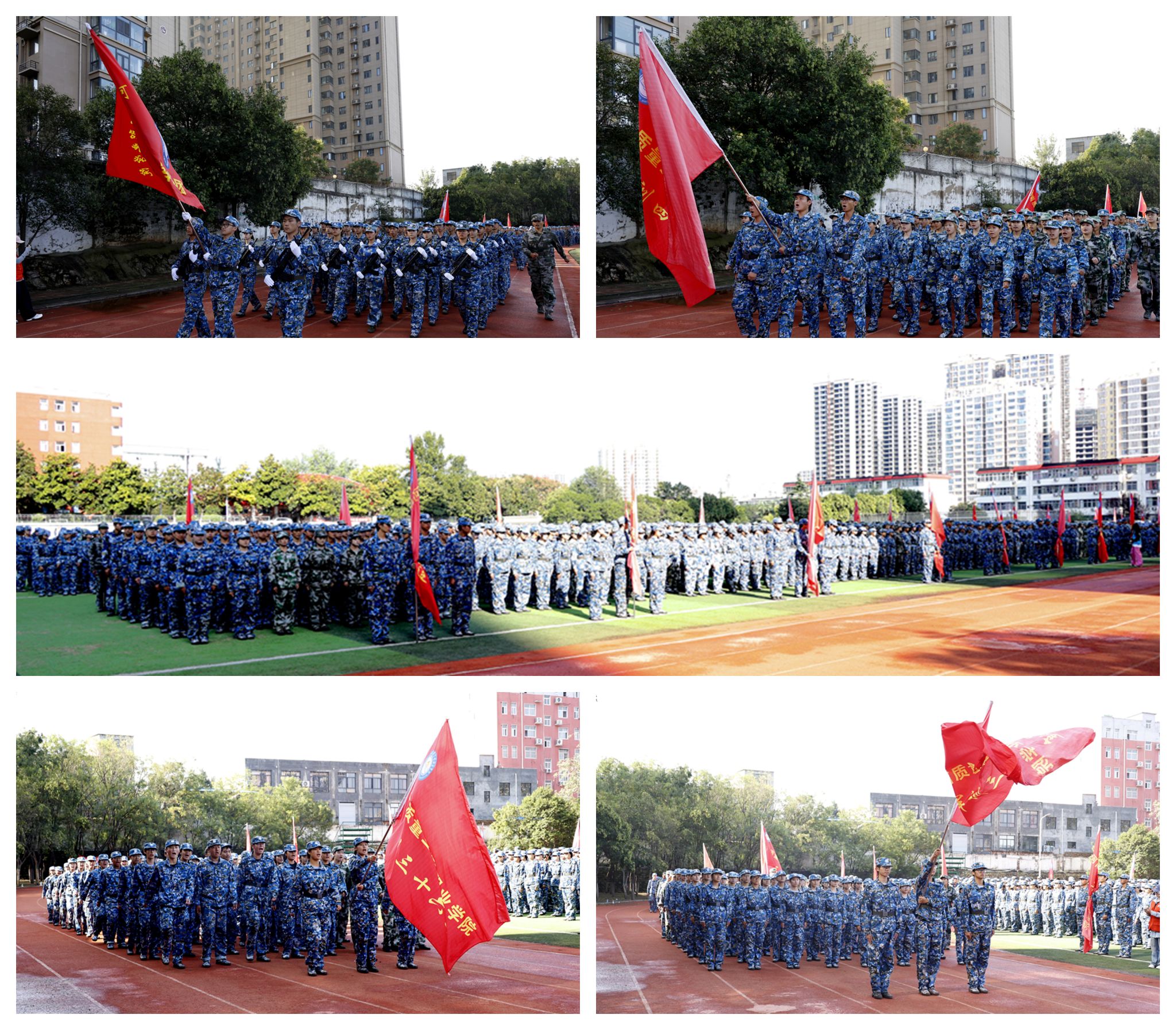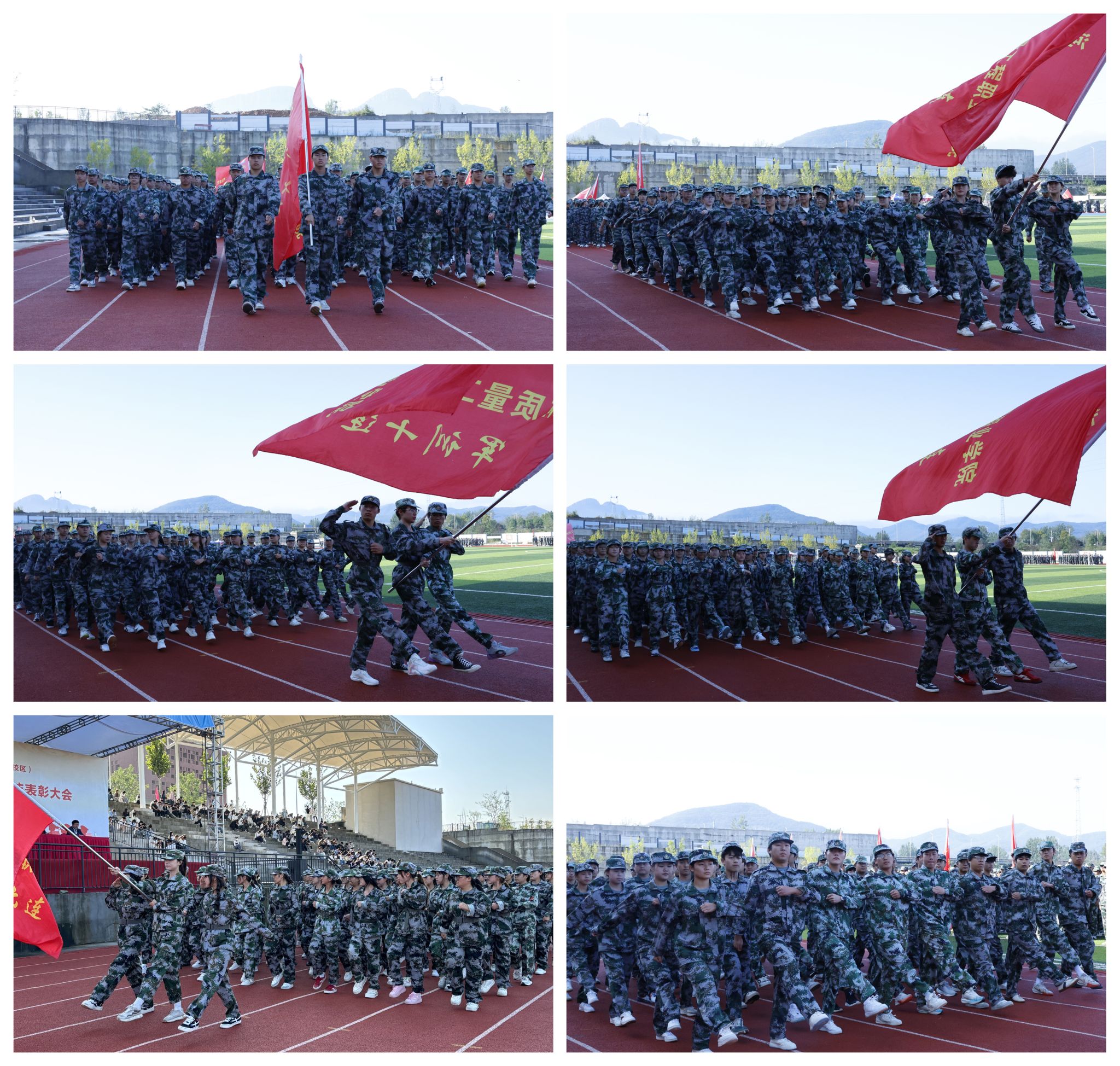 在庄严的国歌声中,新生军训汇报表演拉开序幕。全体方阵身着迷彩、目光坚定,以高昂的士气、严明的纪律、挺拔的军姿、铿锵有力的口号、步调一致的动作,依次经过主席台接受检阅,展现了质院学生朝气蓬勃、奋发向上的精神风貌,赢得现场阵阵掌声。