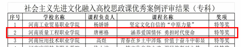 近日,中共河南省委教育工委办公室、河南省教育厅办公室公布了2025年度优秀思政课程资源评审结果。我校马克思主义学院教师唐彬格的作品《涵养爱国情怀 勇担时代使命》荣获“社会主义先进文化融入高校思政课优秀案例”特等奖。本次评审历经高校申报、资格审查、专家评审、综合评议等多轮严格筛选,既体现了获奖教师扎实的教学功底与创新的课程设计理念,也彰显了马克思主义学院在落实立德树人根本任务、推进思政课教学改革创新方面的显著成效。
