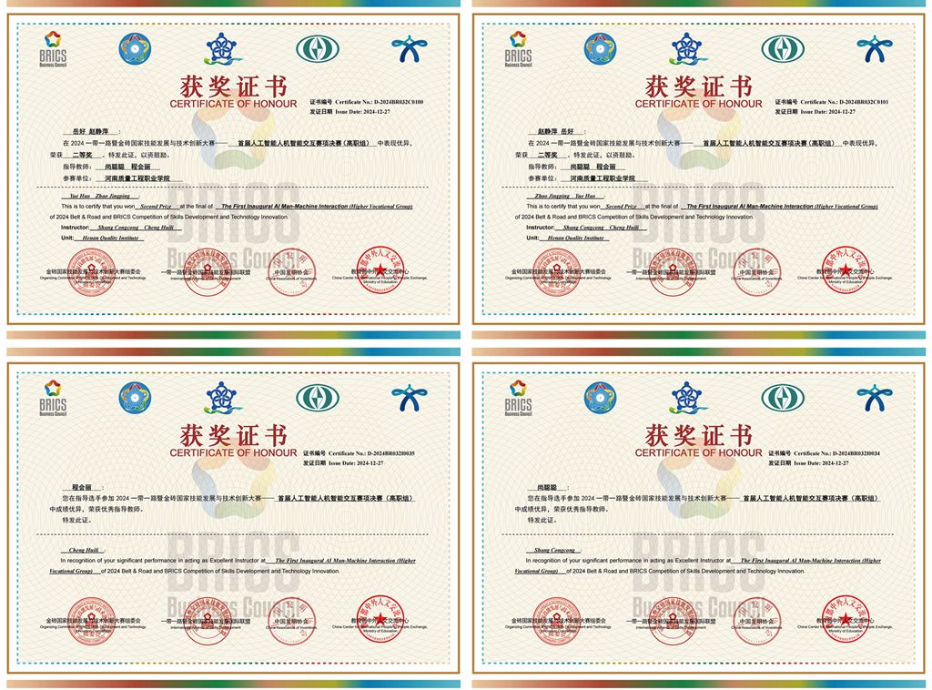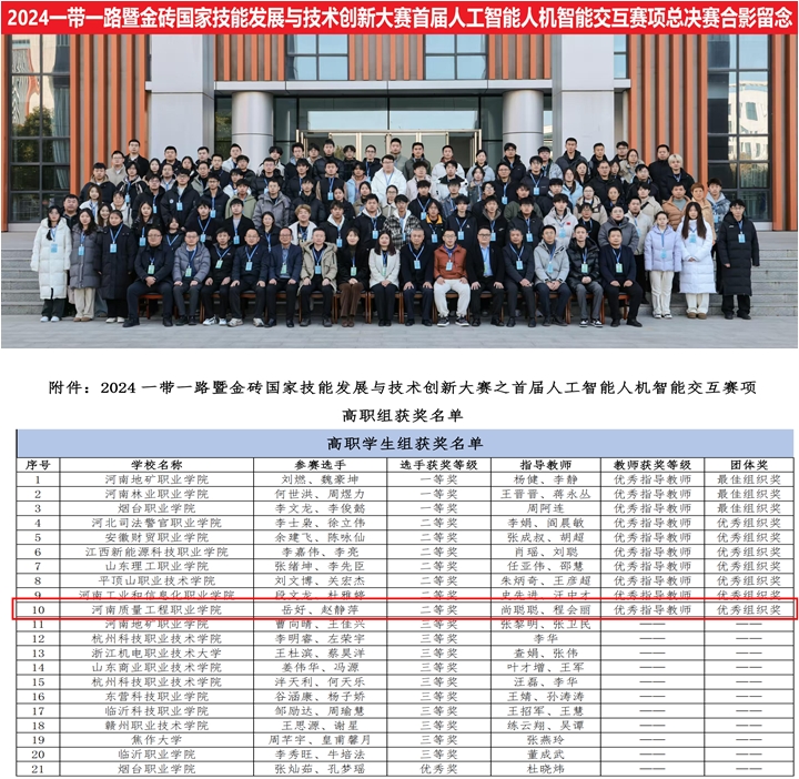 12月18日至21日,2024一带一路暨金砖国家技能发展与技术创新大赛“首届人工智能人机智能交互”赛项高职组决赛在河南地矿职业学院成功举办。计算机技术学院程会丽、尚聪聪老师指导的学生赵静萍、岳好同学凭借出色表现荣获二等奖,程会丽和尚聪聪老师荣获优秀指导老师称号,我校荣获优秀组织奖。