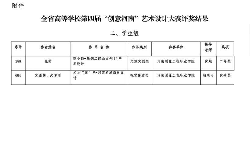 2024年12月,由河南省教育厅主办的全省高等学校第四届“创意河南”艺术设计大赛中,信息工程学院两个作品分别荣获二等奖和优秀奖。其中,学生张霜的作品《萌小戬—舞钢二郎山文创IP产品设计》荣获文旅文创类二等奖;学生宋诺惜和武梦雨的作品《相约“豫”见—河南旅游海报设计》荣获视觉传达类优秀奖。