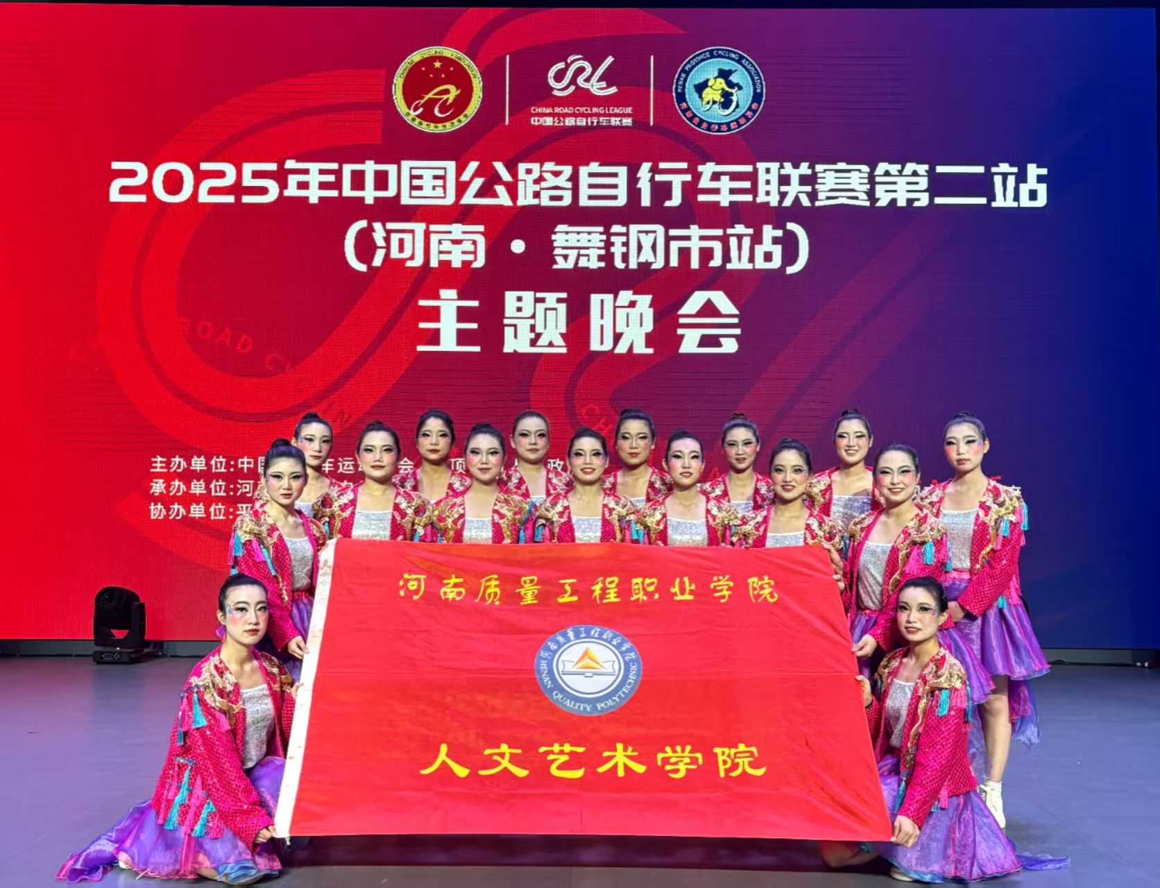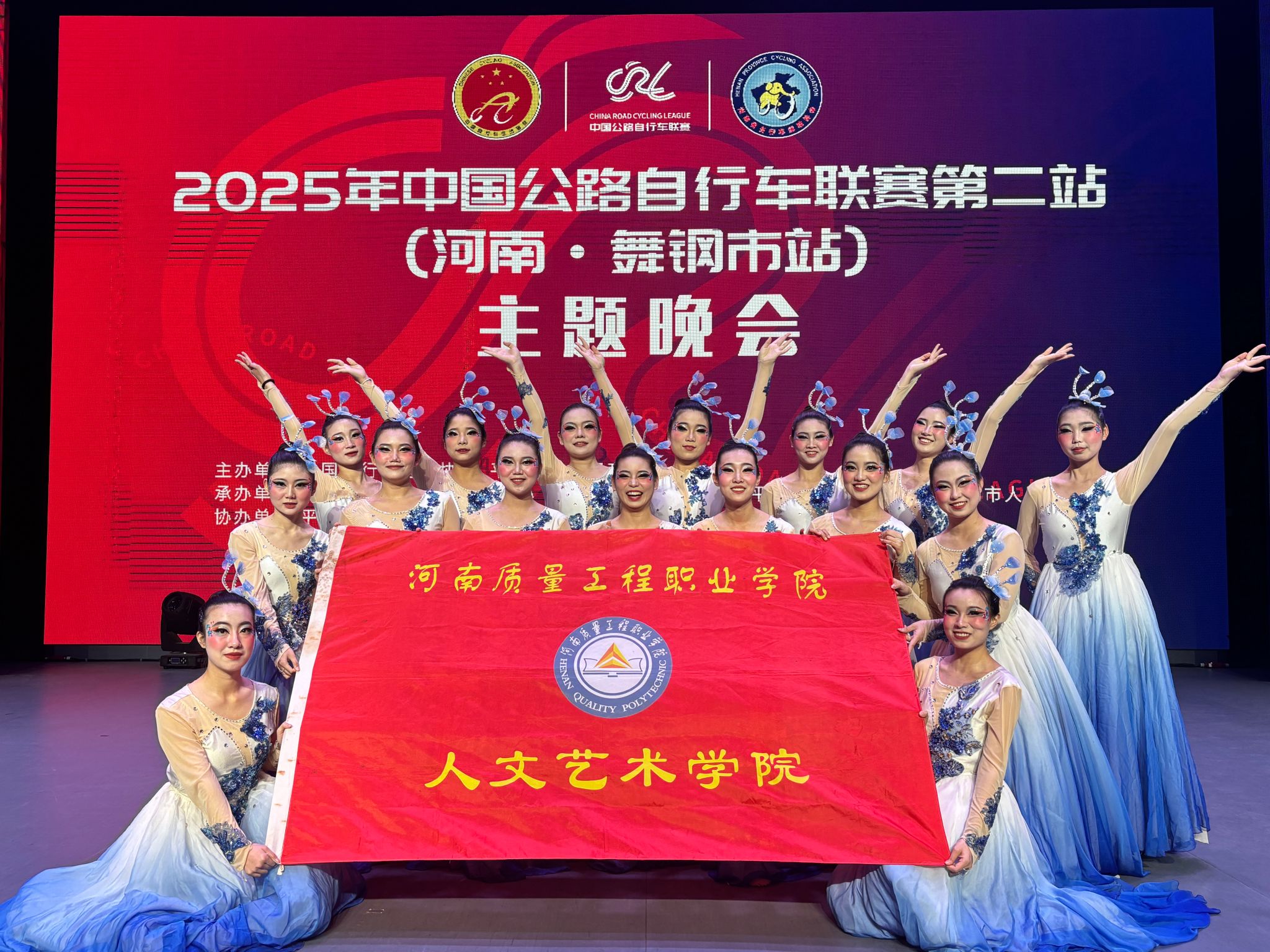 3月28日,2025年中国公路自行车联赛第二站(河南·舞钢市站)在河南省舞钢市拉开序幕,来自河南、北京等33支各省(市)、俱乐部代表队齐聚舞钢,共襄盛举。我校人文艺术学院受邀参演3月29日举办的联赛主题晚会,在这场体育与文化交相辉映的盛会中,人文艺术学院学子带来了由专业教师凌依琳、乔子珂精心编排的《逐梦》《未来可期》两个舞蹈节目。同学们用专业的素养、优美的舞姿和饱满的热情,展现了质院学子的精神气,赢得了现场嘉宾的热烈掌声。
