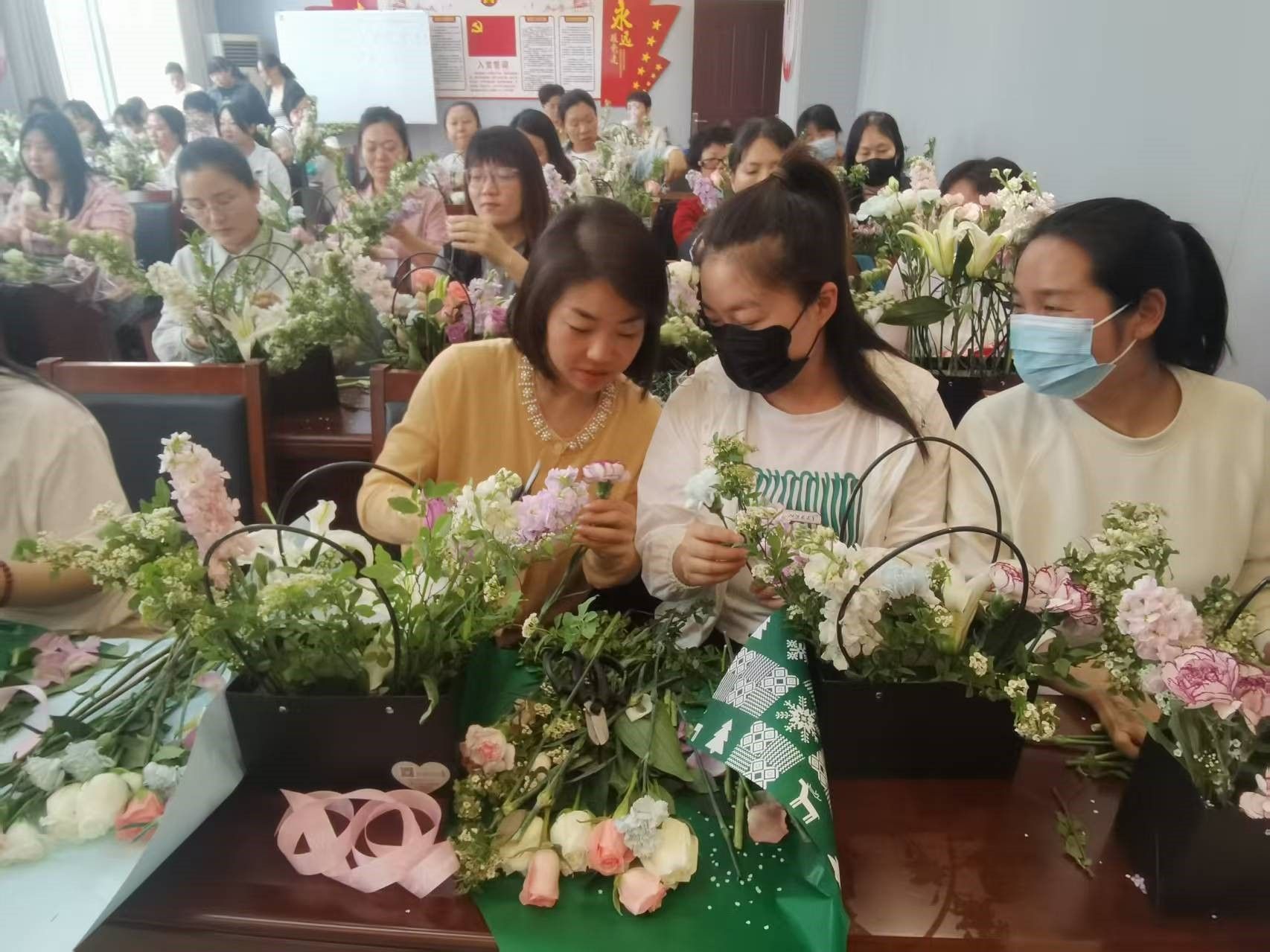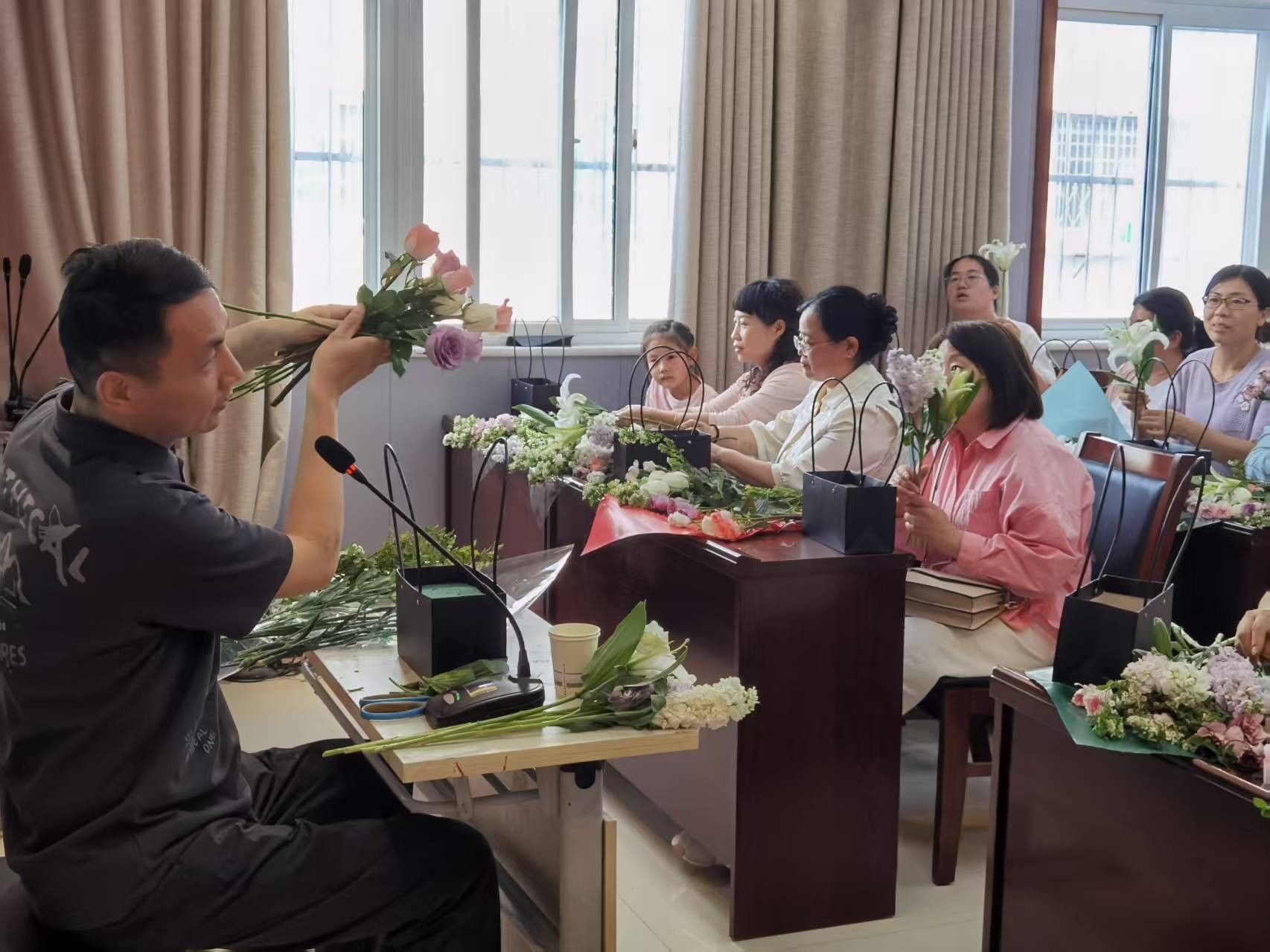 培训课上,李丰武先生从插花的基础知识入手,深入浅出地为学员们讲解了花材的选择、色彩的搭配、造型的设计等要点。他一边耐心讲解理论知识,一边进行现场示范操作。在示范过程中,李丰武先生巧妙地将玫瑰、百合、康乃馨等不同花材进行组合,通过修剪、弯曲、固定等手法,把原本零散的花枝变成了一个个造型优美、层次分明的花艺作品。学员们目不转睛地盯着老师的每一个动作,认真记录要点,还不时拿出手机拍摄留存。
