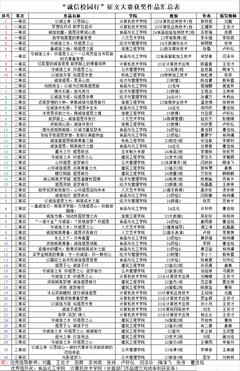 4月初,活动通知下发后,各二级学院(部)高度重视,广泛宣传动员,质院学子积极参与,踊跃投稿,同学们围绕“守诚信之本,怀感恩之心”主题,结合自身经历,聚焦受助脱困、成长蜕变、诚信感恩的典型事迹,重点宣传国家学生资助政策体系,体现党和政府教育资助政策温度。经过各二级学院(部)初赛筛选,共有266件作品进入校级复赛评审。4月底,学生处组织专家对作品进行了认真评选,共评出一等奖10名(其中4名推荐为省级决赛作品)、二等奖20名、三等奖30名,优秀指导教师10名,优秀组织奖2名。