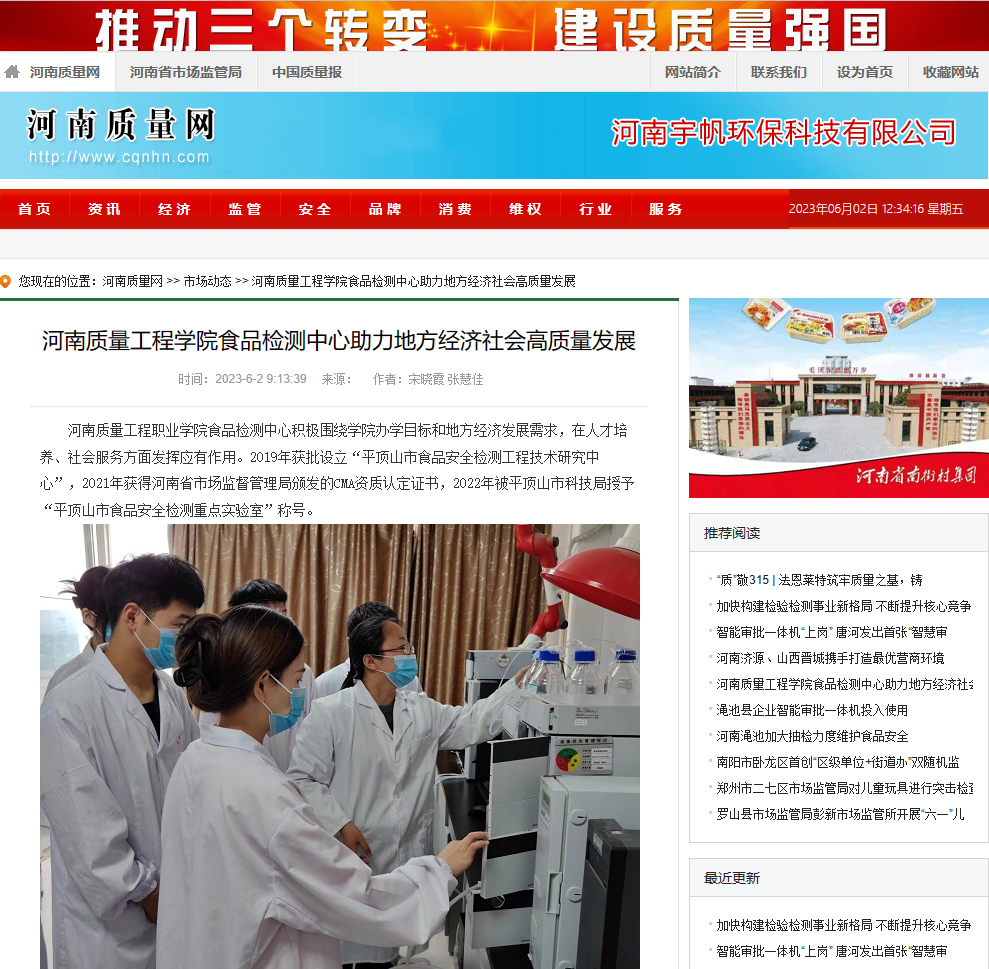 2023年6月3日,《河南质量网》对我院食品检测中心围绕学院办学目标,积极助力地方经济社会高质量发展进行了报道。