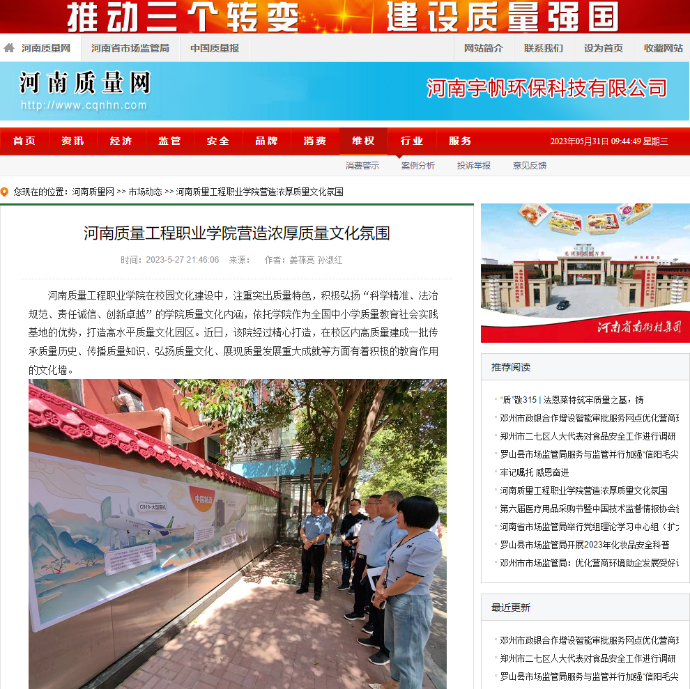 2023年5月27日,《河南质量网》对我院依托作为全国中小学质量教育社会实践基地的优势,大力弘扬学院质量文化内涵,积极营造浓厚质量文化氛围,在校区内高质量建成一批具有积极教育作用的文化墙进行了报道。
