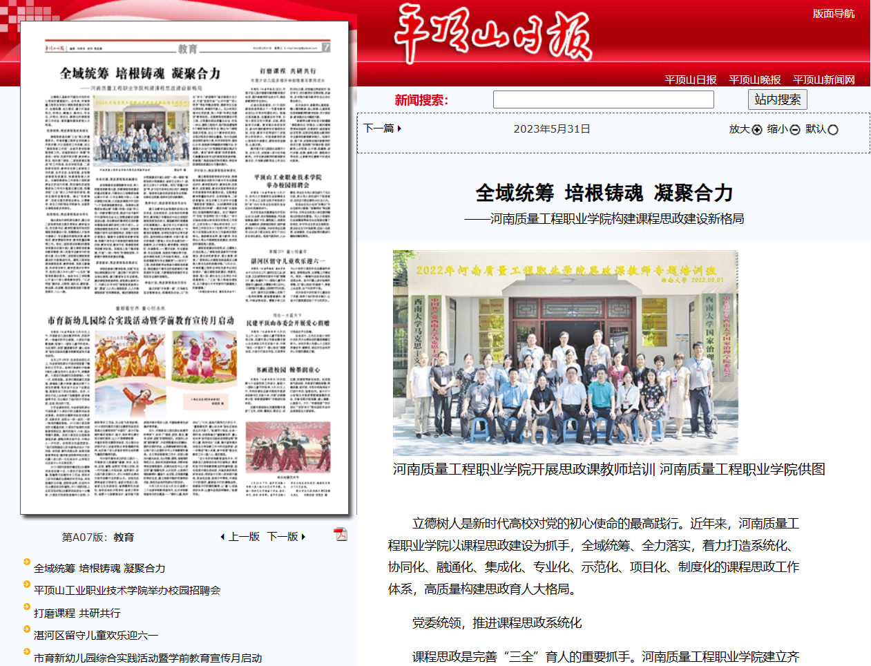 2023年5月31日,《平顶山日报》第A07版对我院课程思政建设情况进行了专题报道。