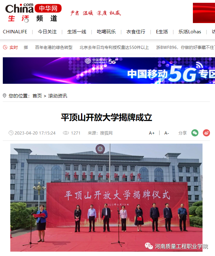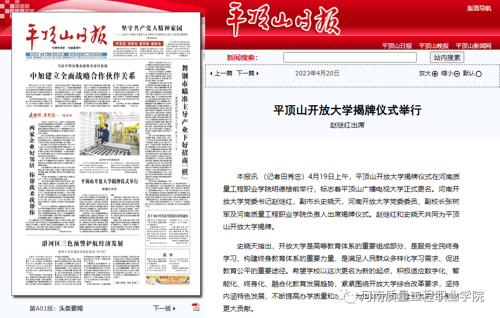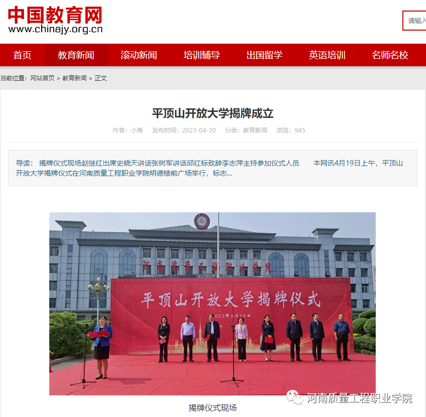 2022年4月20日,中国教育网、中华网、《平顶山日报》等众多媒体对平顶山开放大学揭牌成立进行了专题报道。