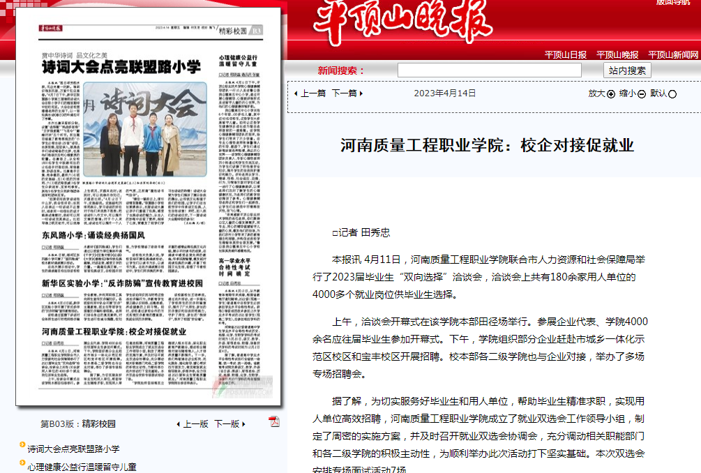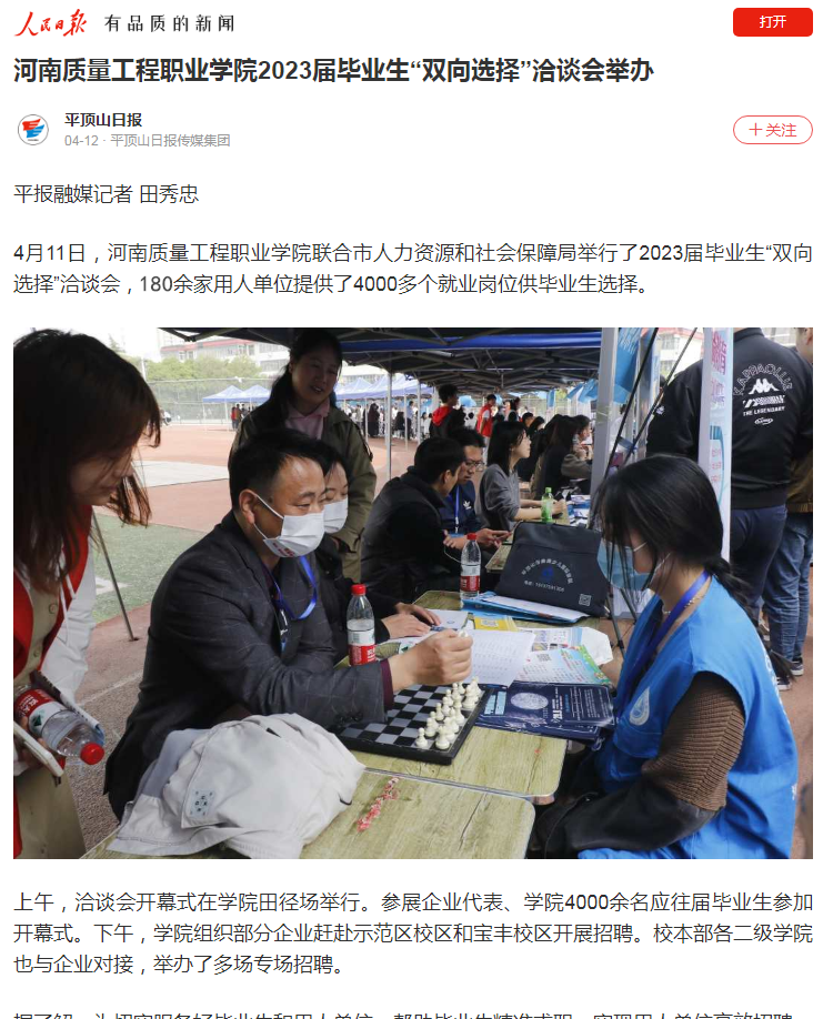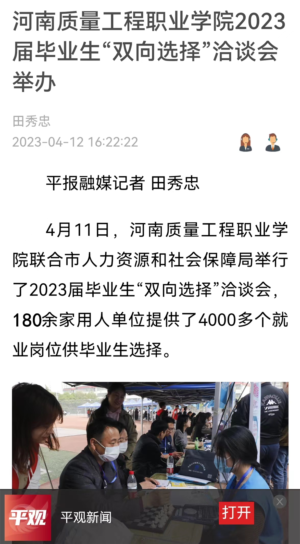 2023年4月12日、4月14日,人民日报移动新媒体聚合平台、平观新闻、《平顶山晚报》等对我院2023届毕业生“双向选择”洽谈会情况进行了报道。